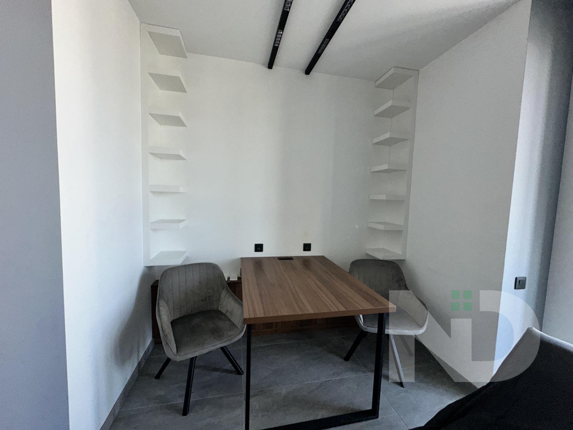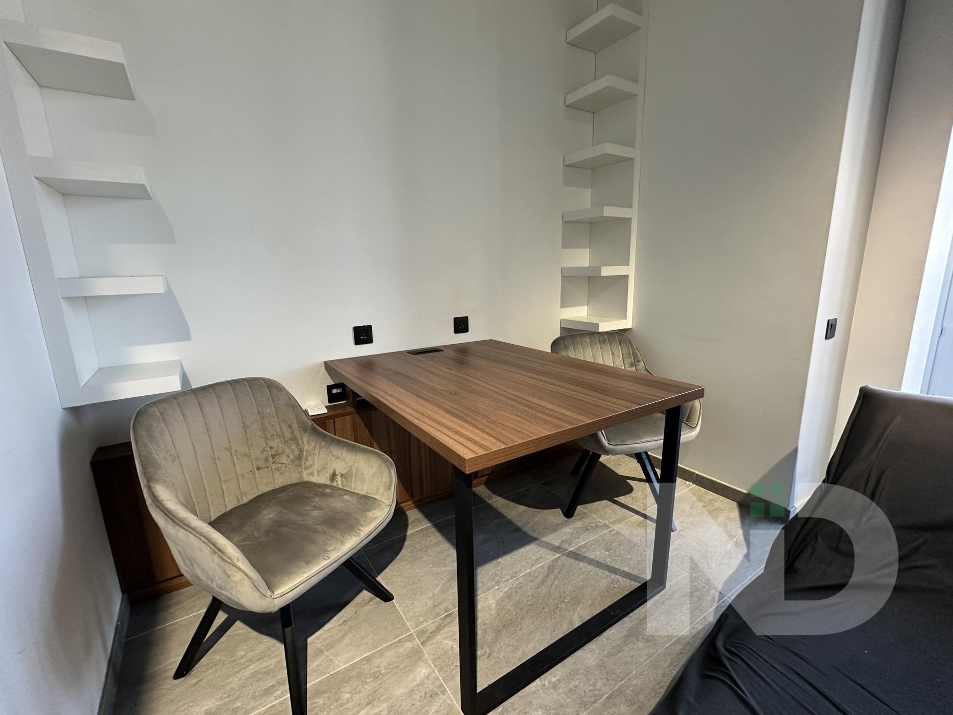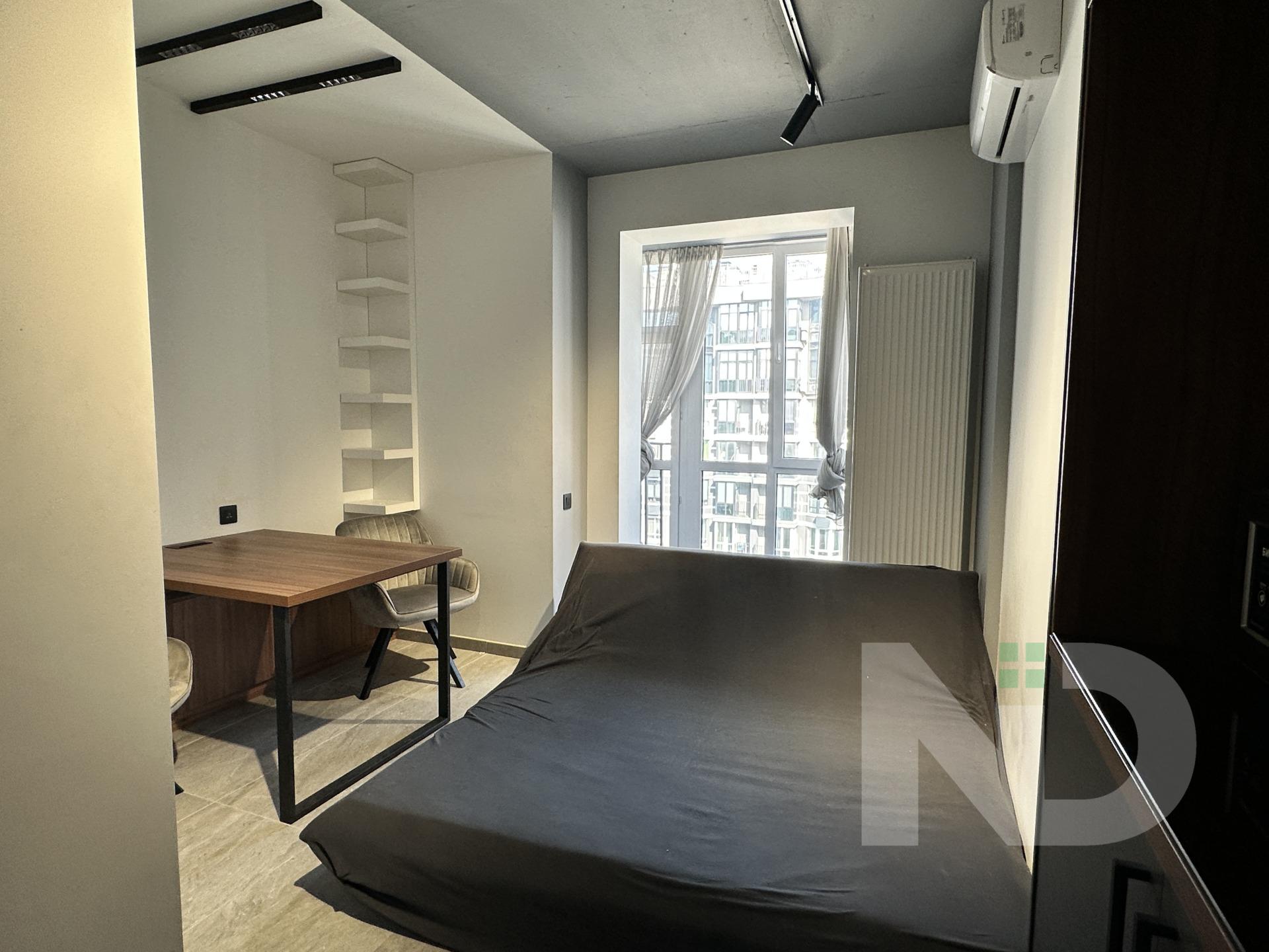 Квартира розташована на 16 поверсі з 18, що забезпечує гарне природне освітлення та приємний вигляд із вікна. Простір організований у форматі open space: зона відпочинку з диваном, компактна кухня з вбудованою технікою та обідня зона. Інтер’єр виконаний у сучасному мінімалістичному стилі – поєднання світлих стін, текстурного дерева та теплих акцентів.