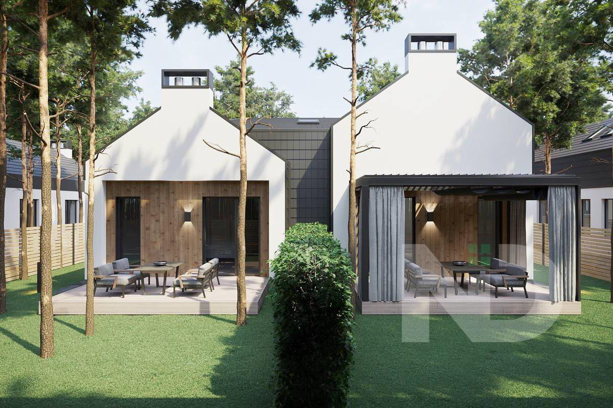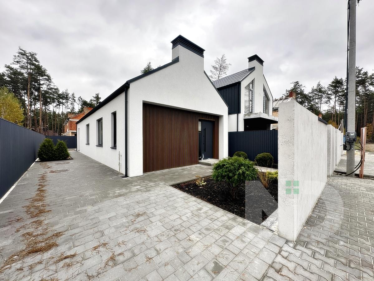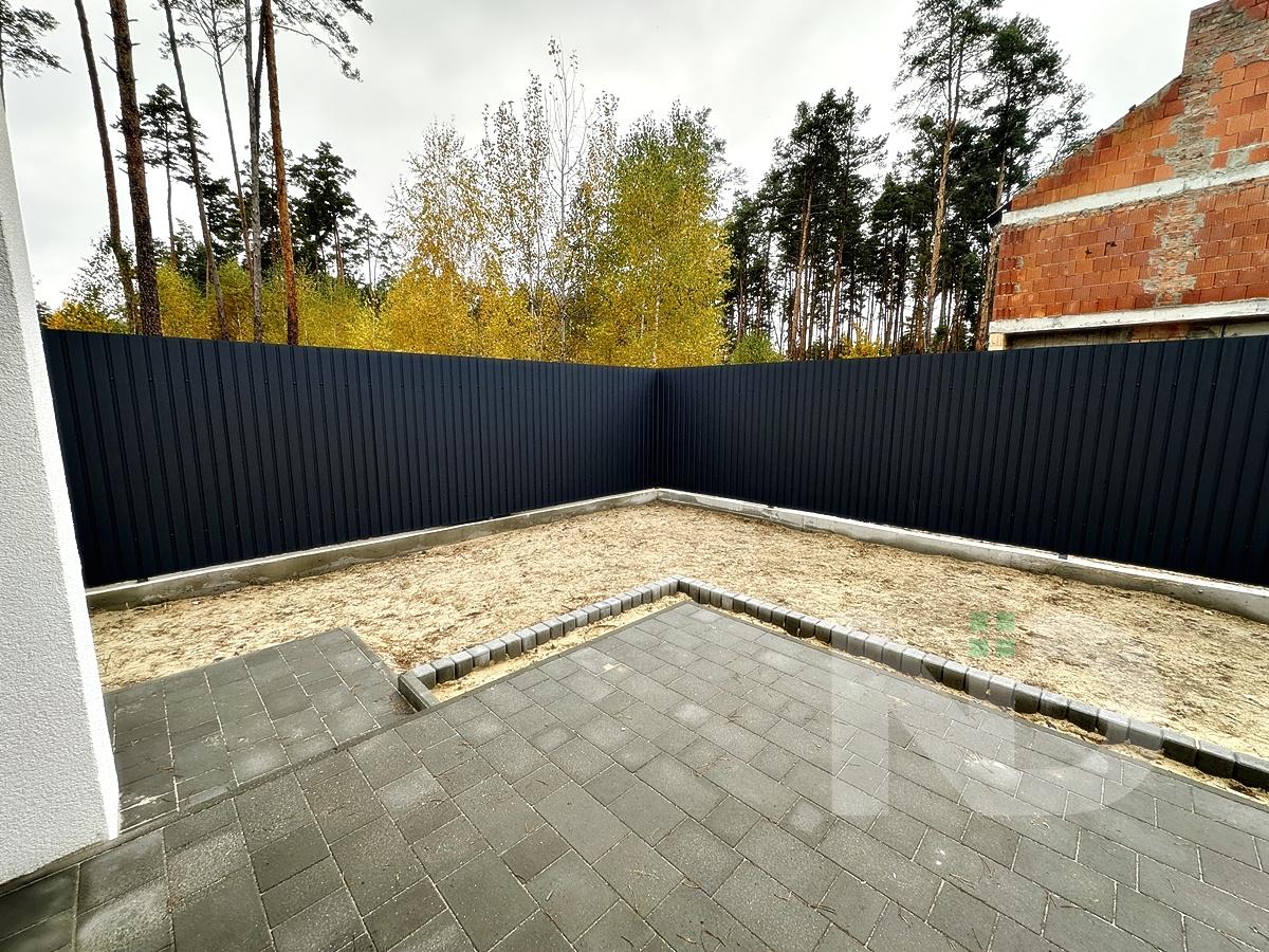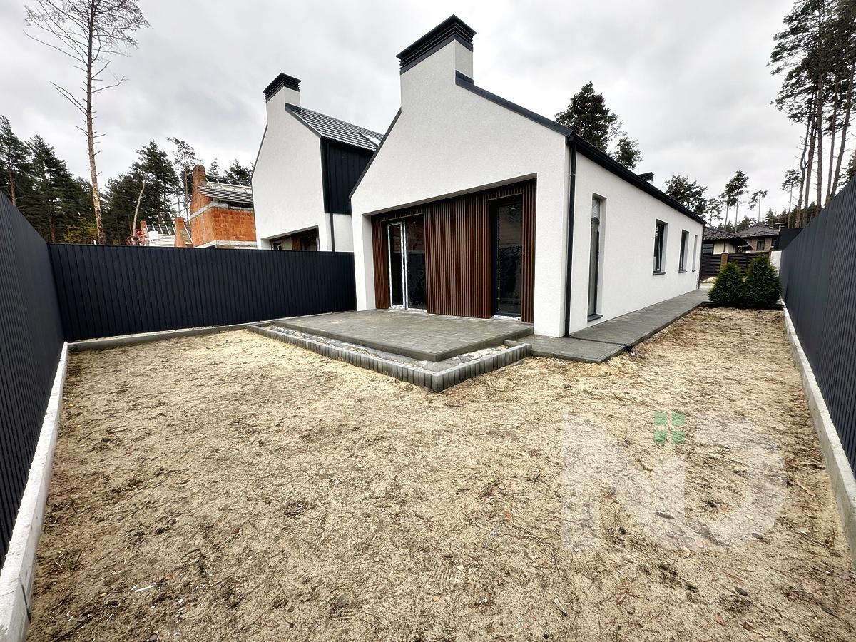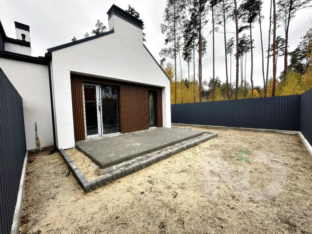 Загальна площа будинку 87.2 м2 + 18.5 м2 тераса, розташовується на ділянці 2.7 соток. Дуже вдале планування: передпокій з місцем під шафу, технічна кімната, 2 санвузли, 2 спальні кімнати по 13.7 м2, гардероб та простора кухня-вітальня 27.6 м2 з другим світлом. З вітальні вихід на бетоновану терасу 18.5 м2 та задній двір з соснами.