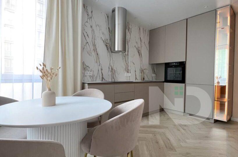 Помешкання має великі панорамні вікна, з яких відкривається неймовірний краєвид на місто. Простора кухня-вітальня з виходом на велику терасу створює затишну атмосферу та дає можливість насолоджуватися ранковою кавою просто неба.