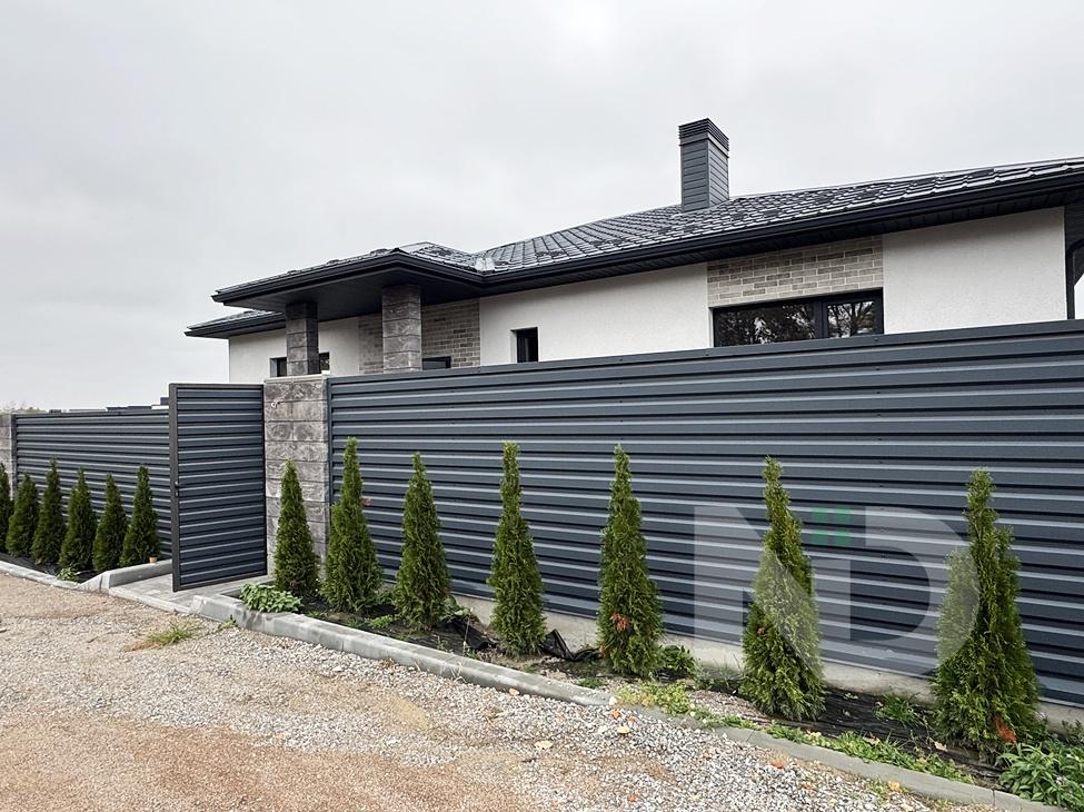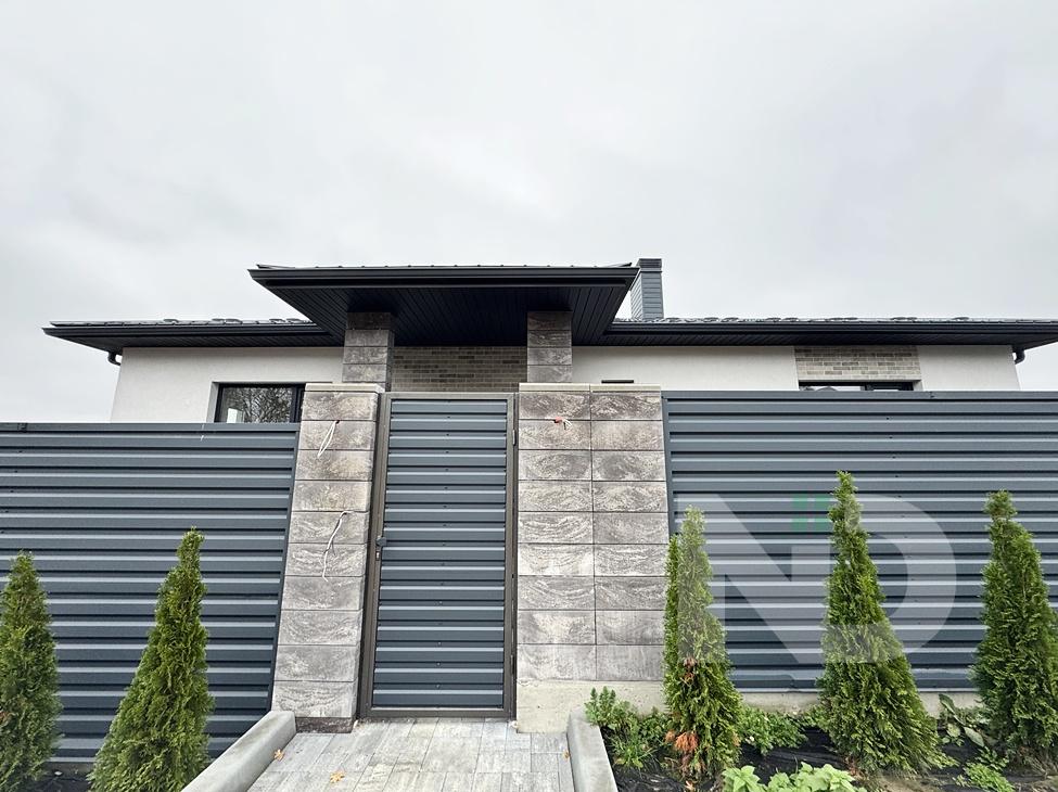 На території облаштовано вимощення доріжок і паркомісце для двох автомобілів, покритих тротуарною плиткою. Є фасадне озеленення — уздовж паркану висаджені туї Смарагд. Територія огороджена парканом із оцинкованого металопрофілю графітового кольору. Встановлені відкатні ворота з підведенням під автоматику та хвіртка з автоматичним замком CISO і підведенням електрики.