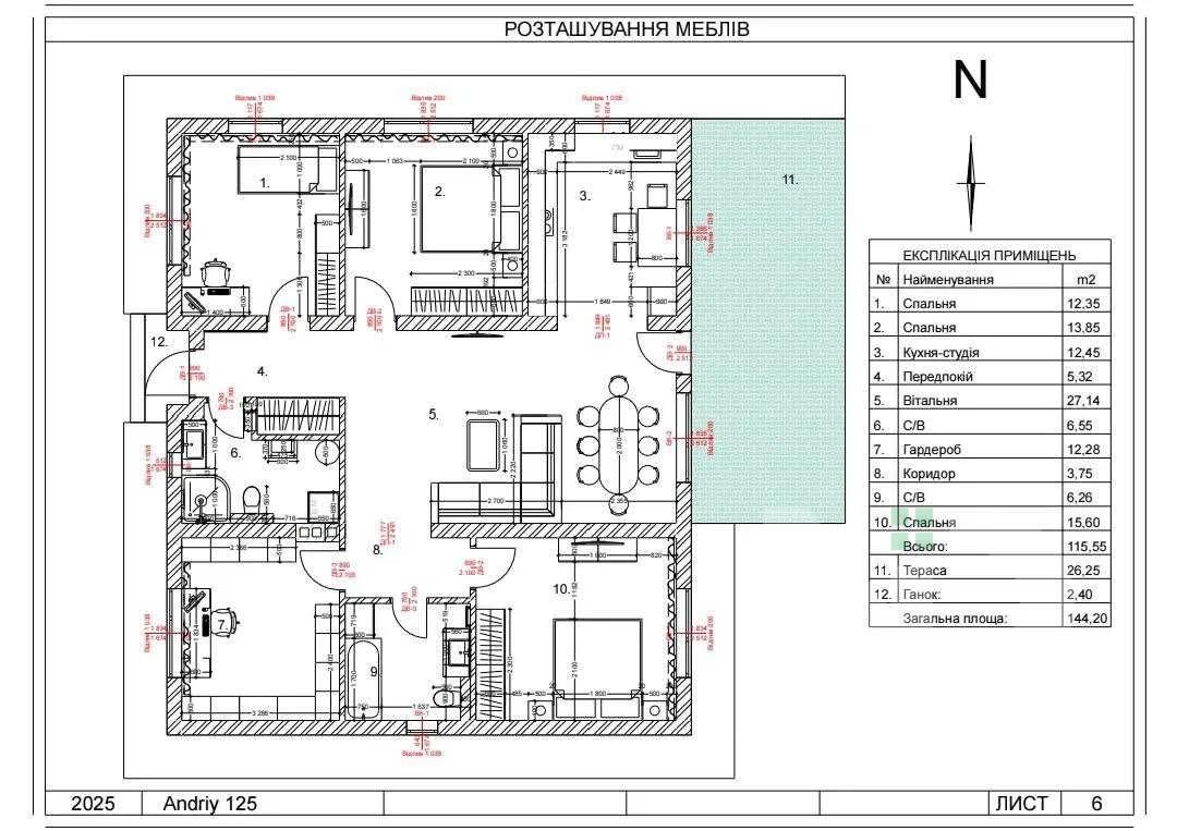 Продається одноповерховий будинок, розташований на ділянці площею 6 соток по вулиці Плужника, 8. Будинок має продумане планування без неефективних площ, що включає чотири окремі спальні (12,35 м²; 12,28 м²; 13,85 м²; 15,6 м²), простору вітальню площею 27,14 м², кухню-студію 12,45 м² та два санвузли (6,55 м² і 6,26 м²). Передбачено велику зручну терасу площею 28 м², яка може використовуватись як зона відпочинку.