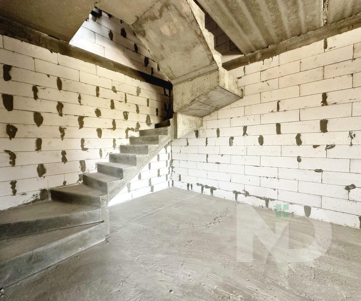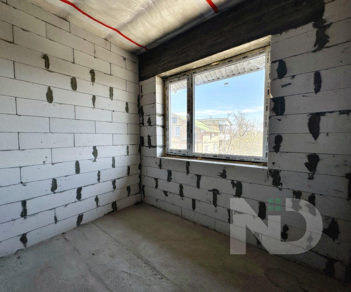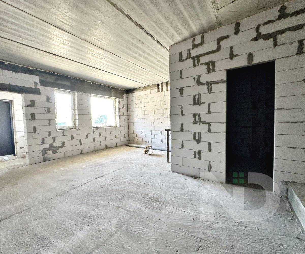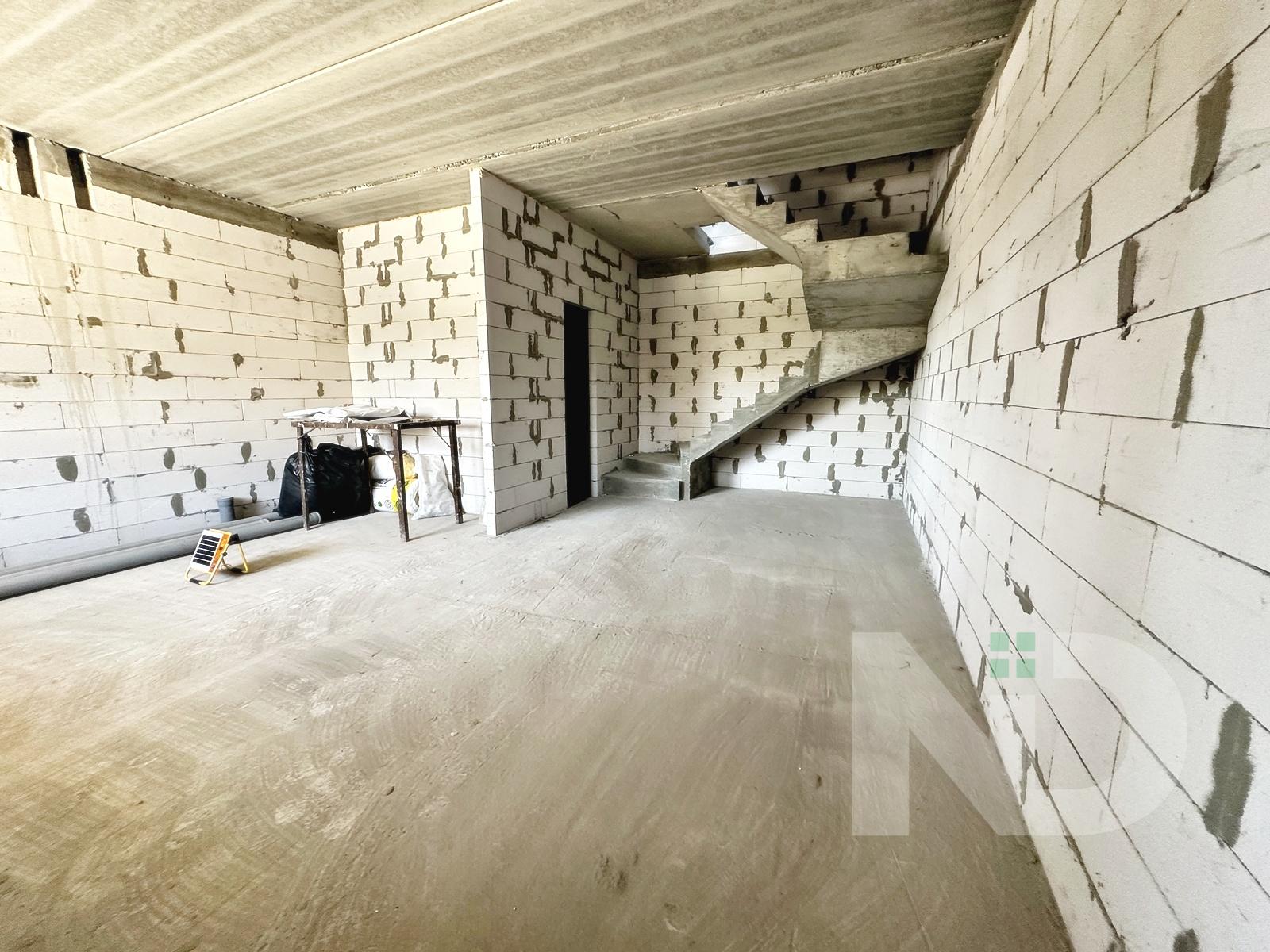 Загальна площа 90.6 м2. Дуже вдале планування: на першому поверсі передпокій з місцем під шафу, гостьовий санвузол та велика кухня-вітальня 36.4 м2. На другий поверх ведуть бетонні сходи, тут розташовуються 2 спальні та ванна кімната. Є можливість облаштувати повноцінну кімнату на 3му поверсі в 20 м2, висота в конику 2.6 метри, тут вже встановлено мансардне вікно та залізний каркас для сходів. Перекриття між другим та третім поверхом дерев’яне, утеплене 200 мм мінвати, та підбите дерев’яною дошкою.