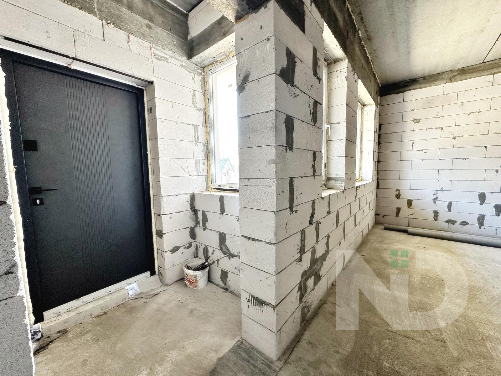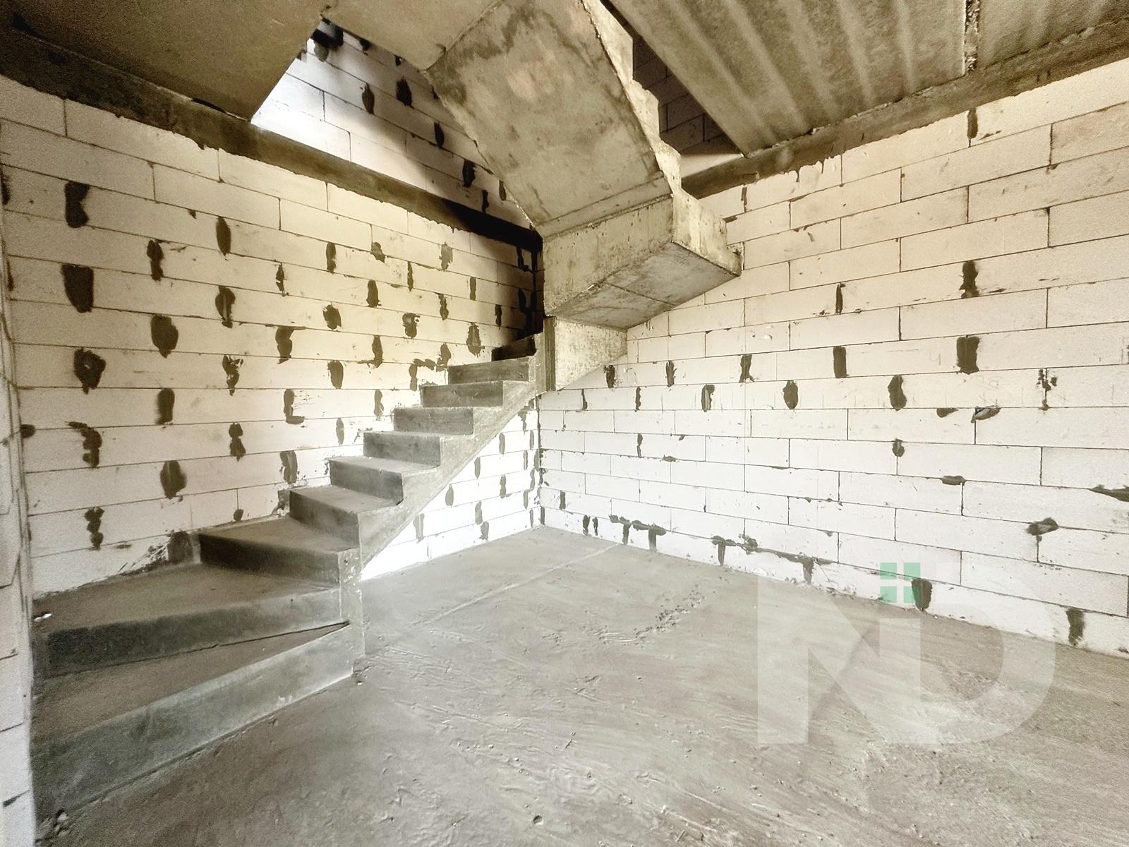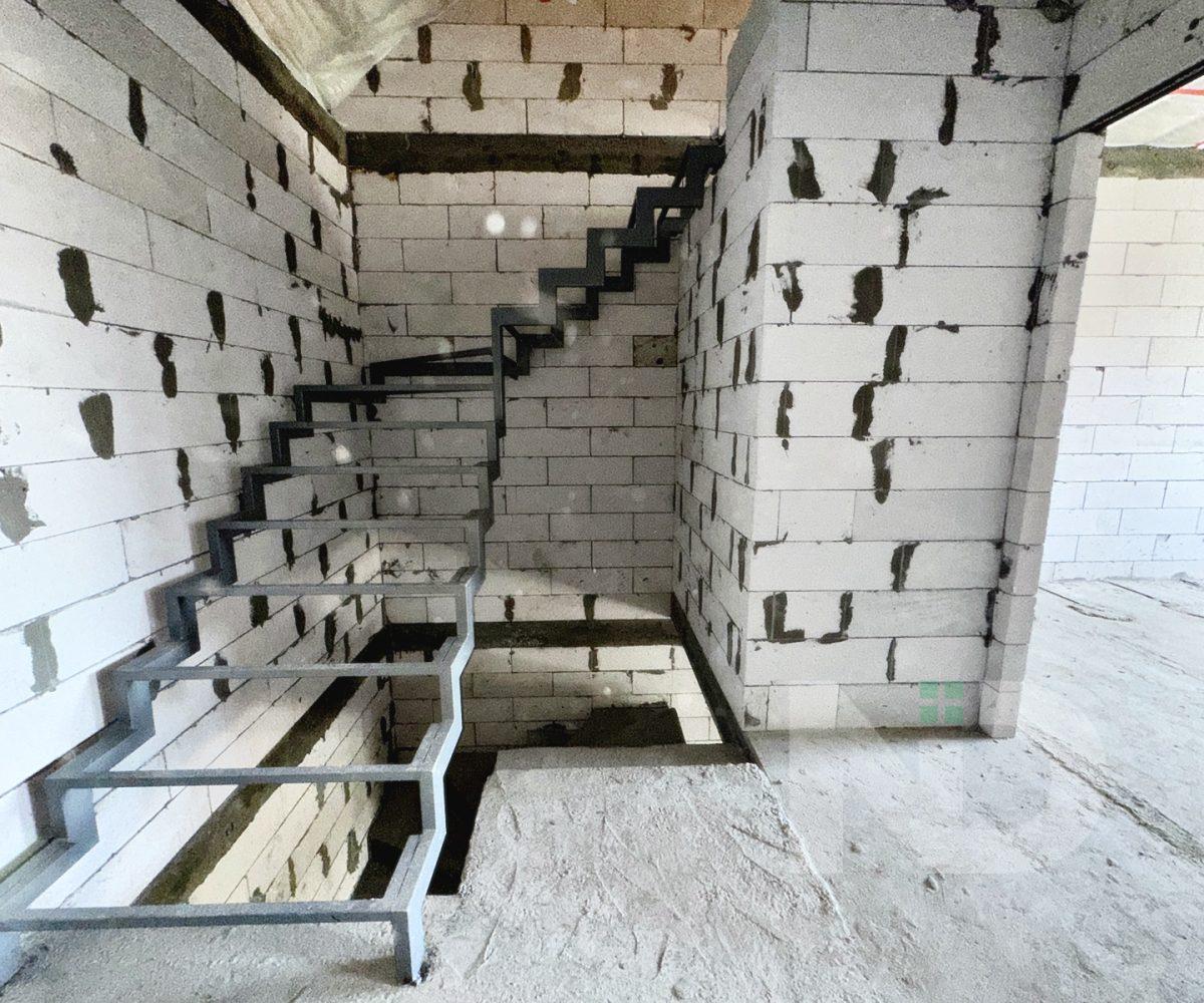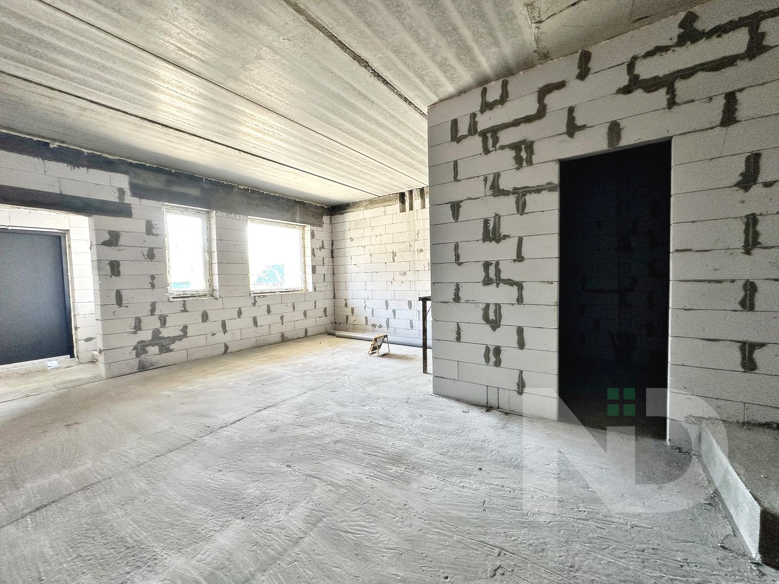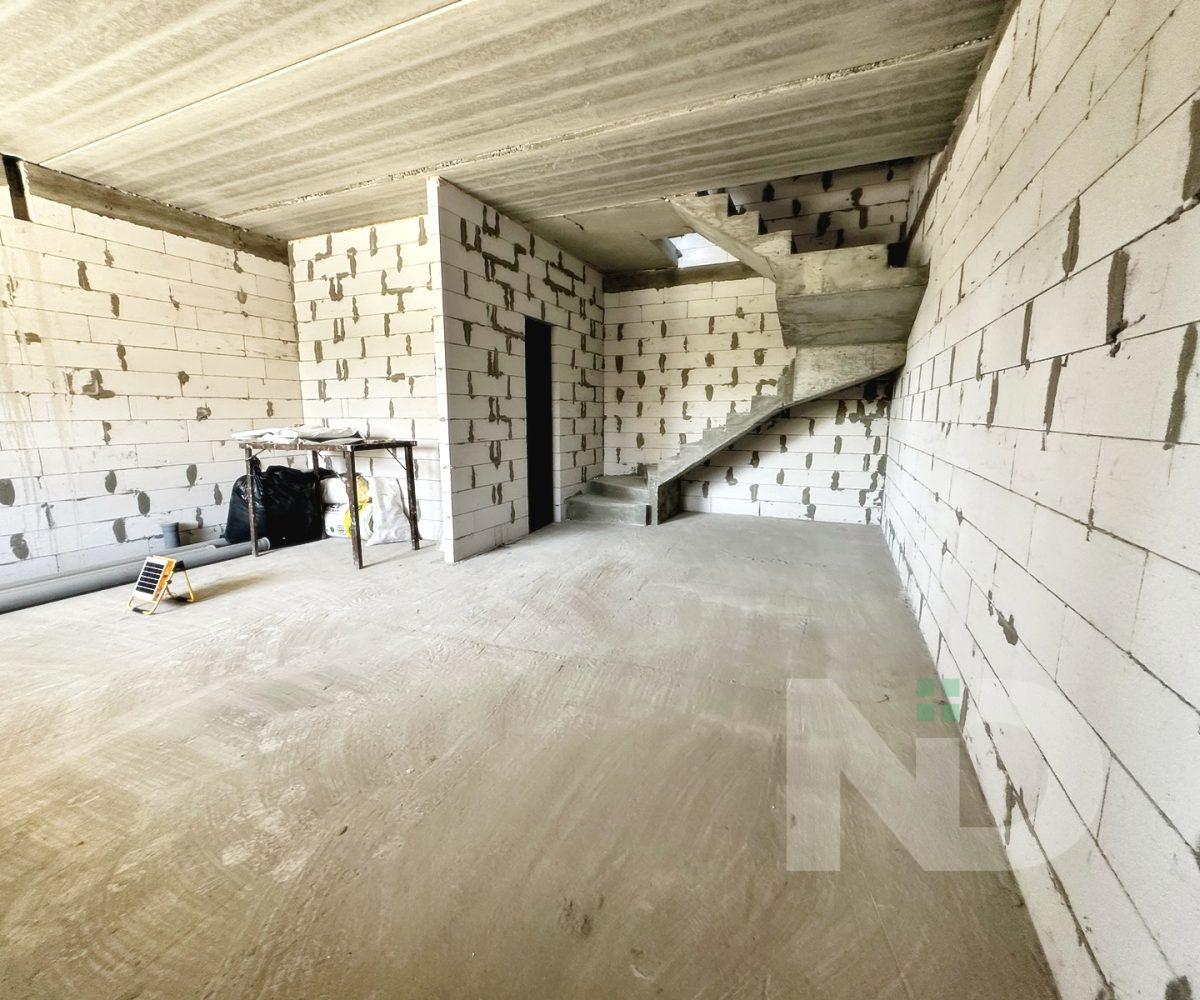 Загальна площа 90.6 м2. Дуже вдале планування: на першому поверсі передпокій з місцем під шафу, гостьовий санвузол та велика кухня-вітальня 36.4 м2. На другий поверх ведуть бетонні сходи, тут розташовуються 2 спальні та ванна кімната. Є можливість облаштувати повноцінну кімнату на 3му поверсі в 20 м2, висота в конику 2.6 метри, тут вже встановлено мансардне вікно та залізний каркас для сходів. Перекриття між другим та третім поверхом дерев’яне, утеплене 200 мм мінвати, та підбите дерев’яною дошкою.