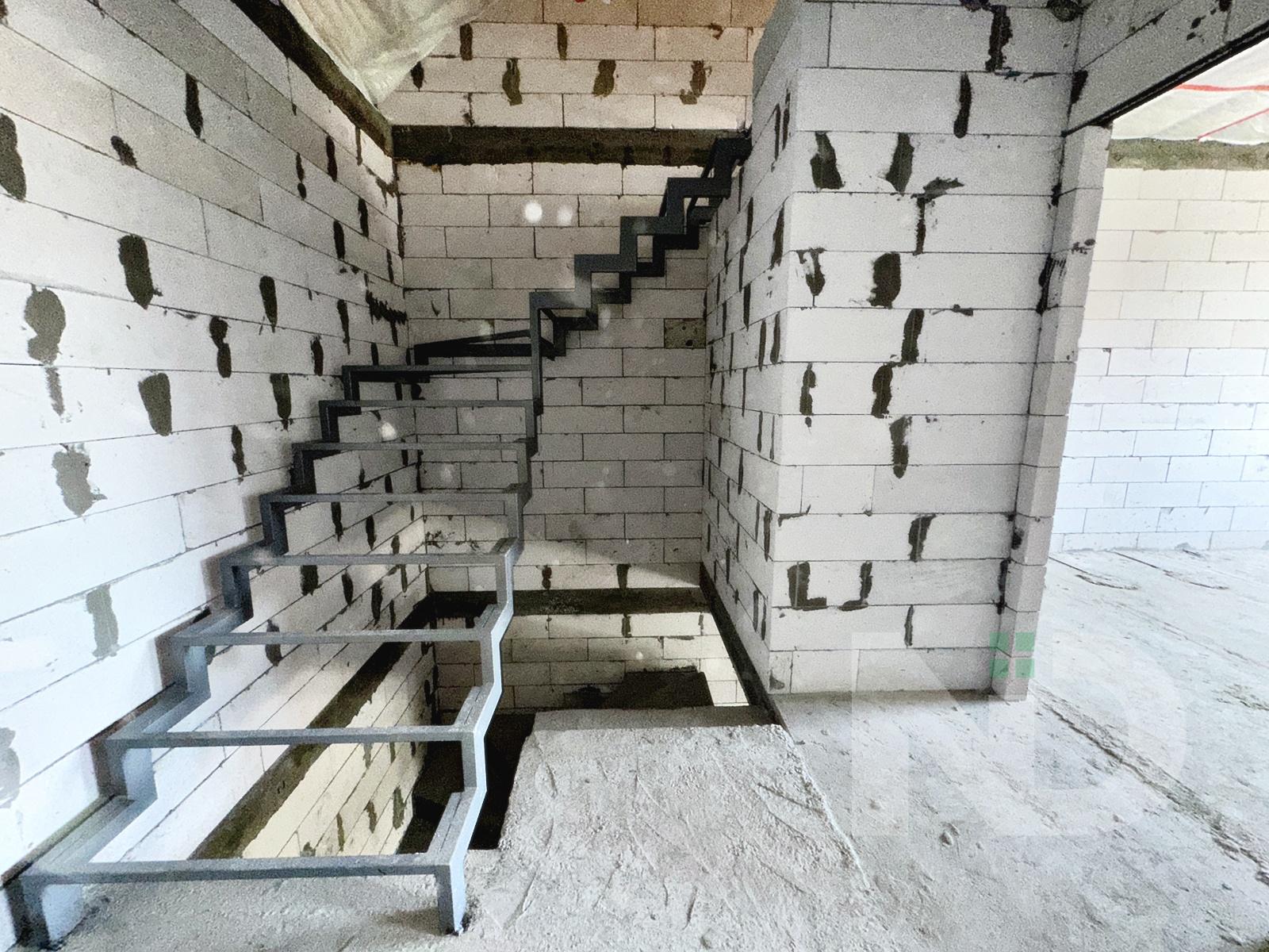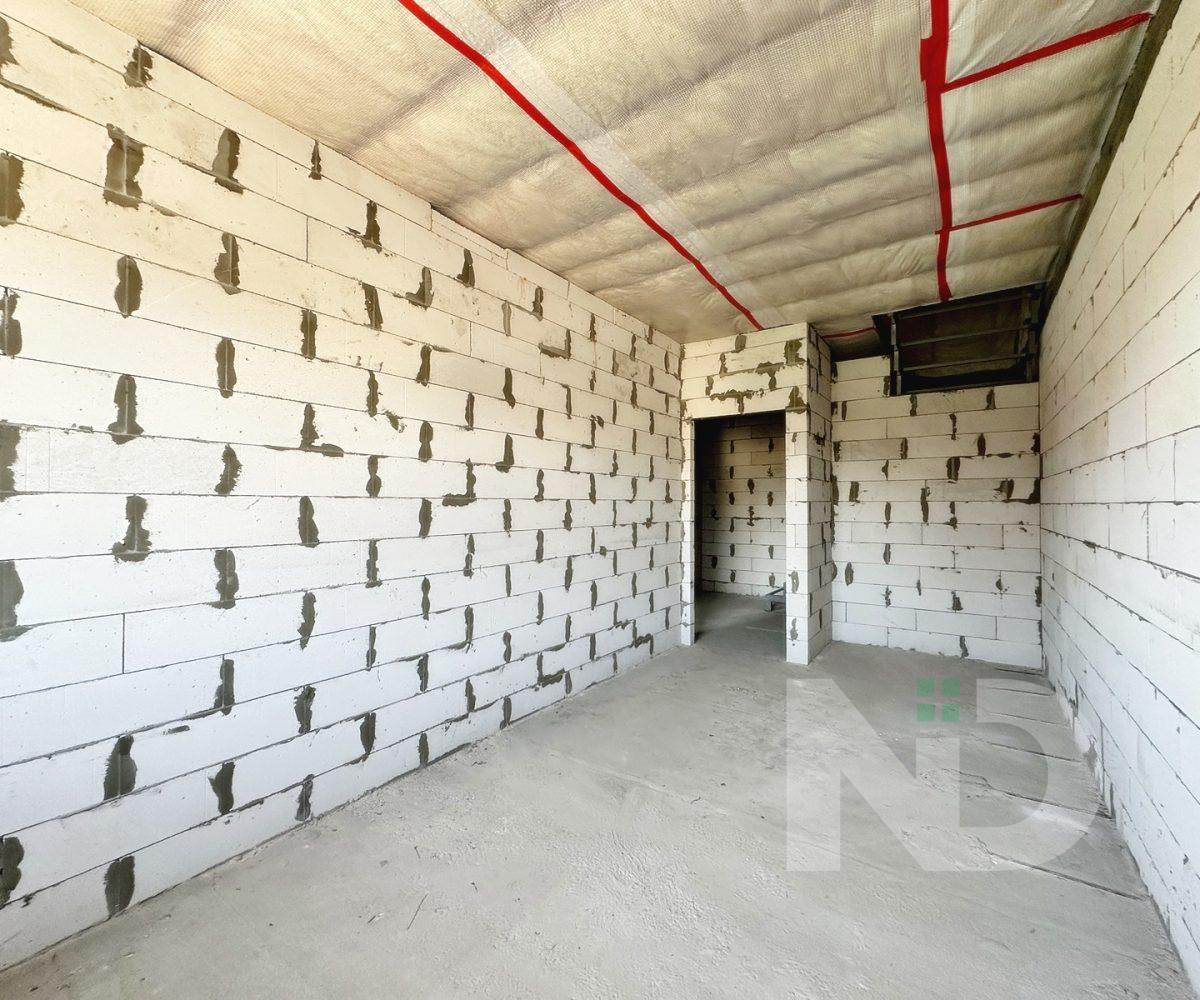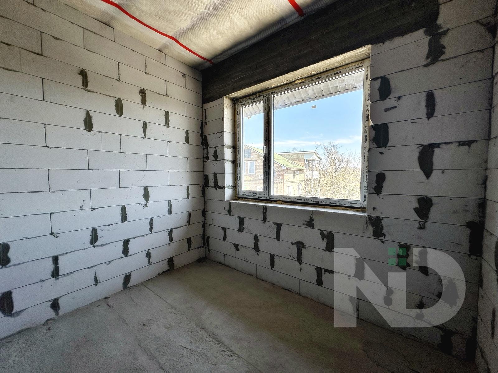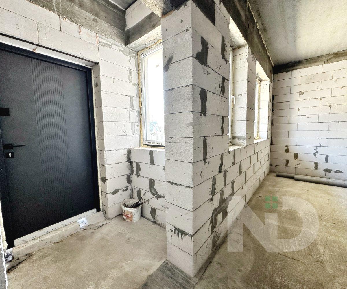 Загальна площа 90.6 м2. Дуже вдале планування: на першому поверсі передпокій з місцем під шафу, гостьовий санвузол та велика кухня-вітальня 36.4 м2. На другий поверх ведуть бетонні сходи, тут розташовуються 2 спальні та ванна кімната. Є можливість облаштувати повноцінну кімнату на 3му поверсі в 20 м2, висота в конику 2.6 метри, тут вже встановлено мансардне вікно та залізний каркас для сходів. Перекриття між другим та третім поверхом дерев’яне, утеплене 200 мм мінвати, та підбите дерев’яною дошкою.