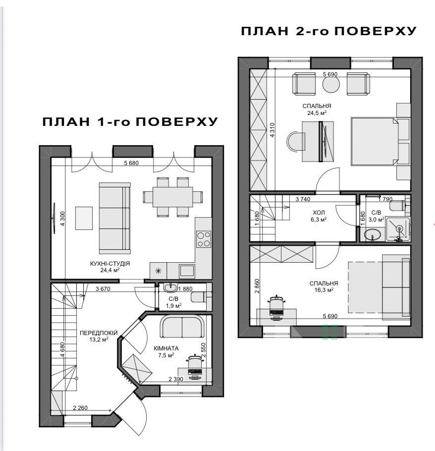 Другий поверх займають дві великі спальні . Тут також є хол та ще один санвузол. Великі вікна наповнюють кімнати світлом, створюючи відчуття простору і затишку.