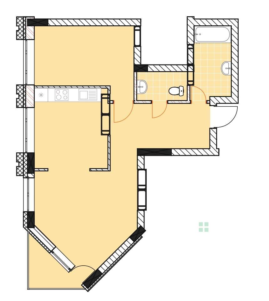 Санвузол роздільний, що значно підвищує комфорт у повсякденному користуванні. Завдяки нестандартній геометрії квартири та великим вікнам приміщення наповнені природним світлом і виглядають просторо.