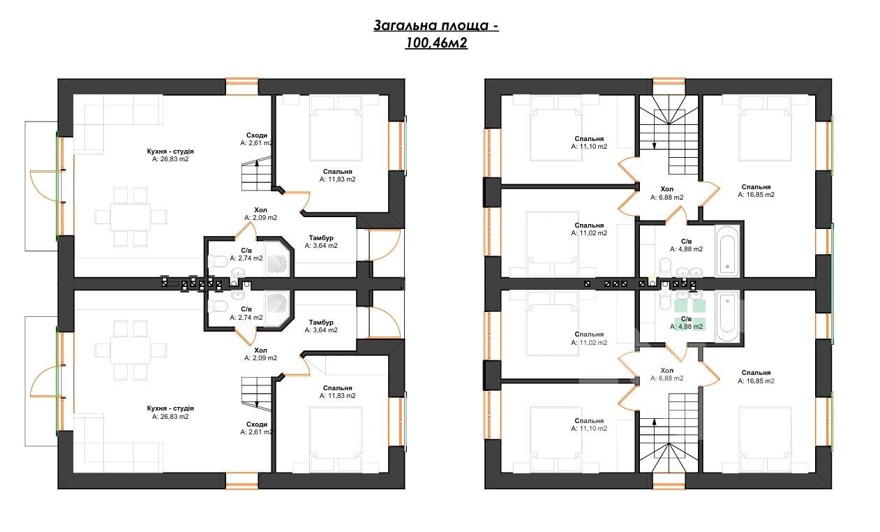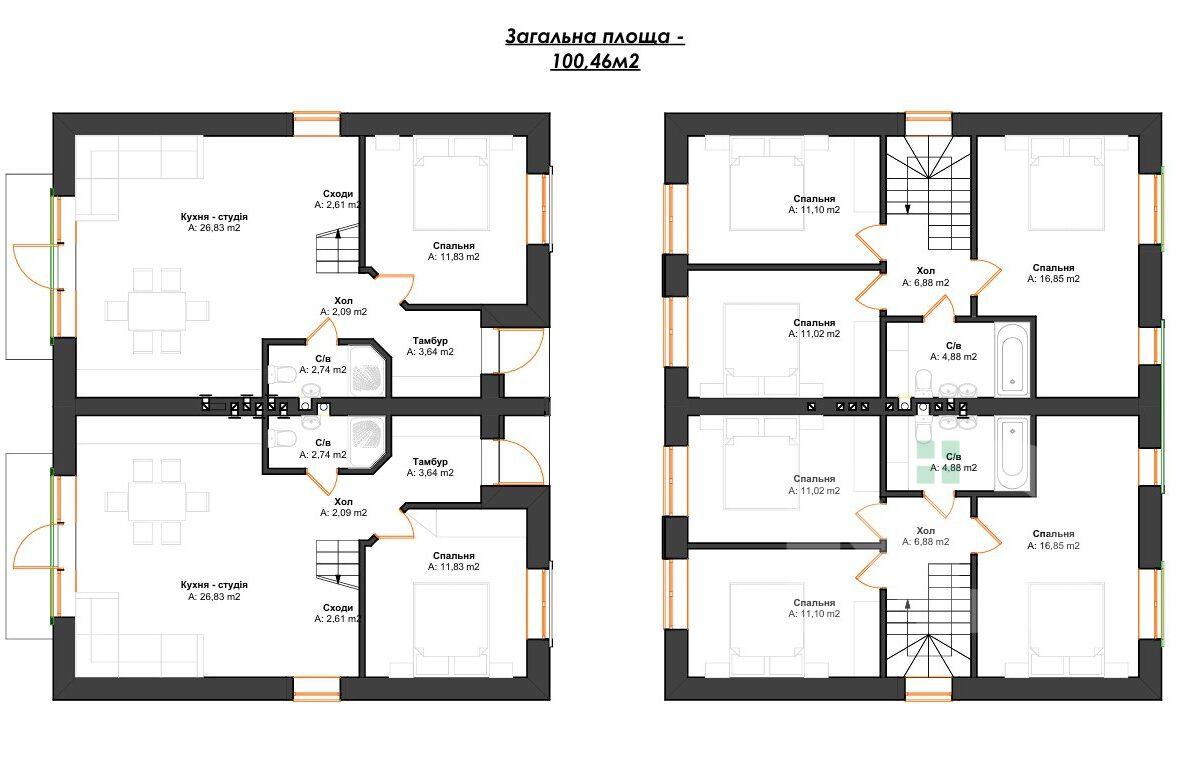 Загальна площа кожного дуплекса — 100,4 м², з власною земельною ділянкою площею від 2 соток. Раціональне планування дозволяє ефективно використовувати простір для всієї родини. Будинок побудований з якісного керамоблоку з утепленням пінопластом, що забезпечує енергоефективність і комфорт у будь-яку пору року. Між першим та другим поверхами — бетонні плити перекриття, бетонні сходи. Раціональне планування будинку: на першому поверсі простора кухня-вітальня, кабінет , санвузол. На другому поверсі роздільні три кімнати та санвузол.