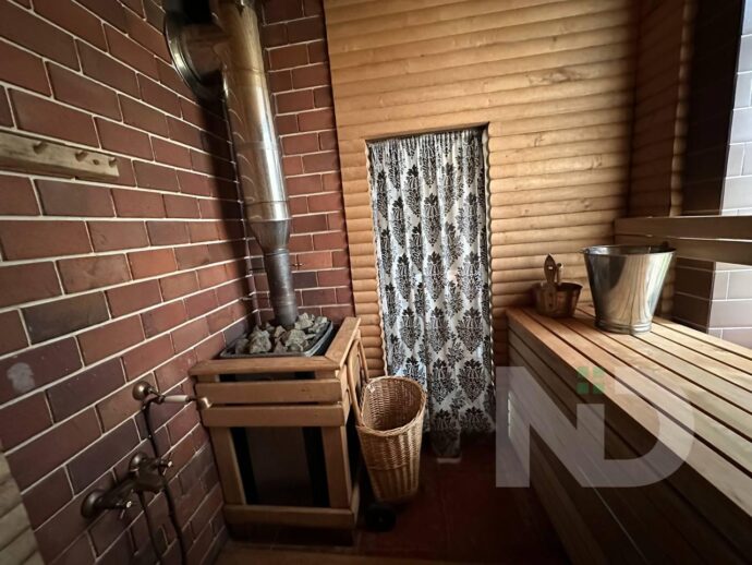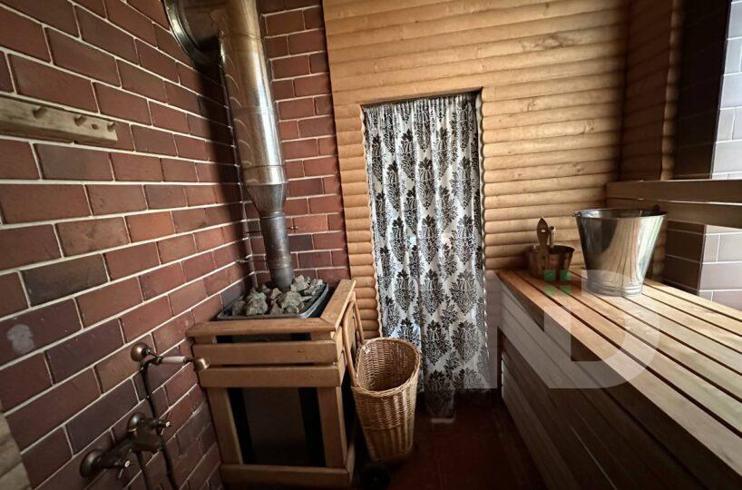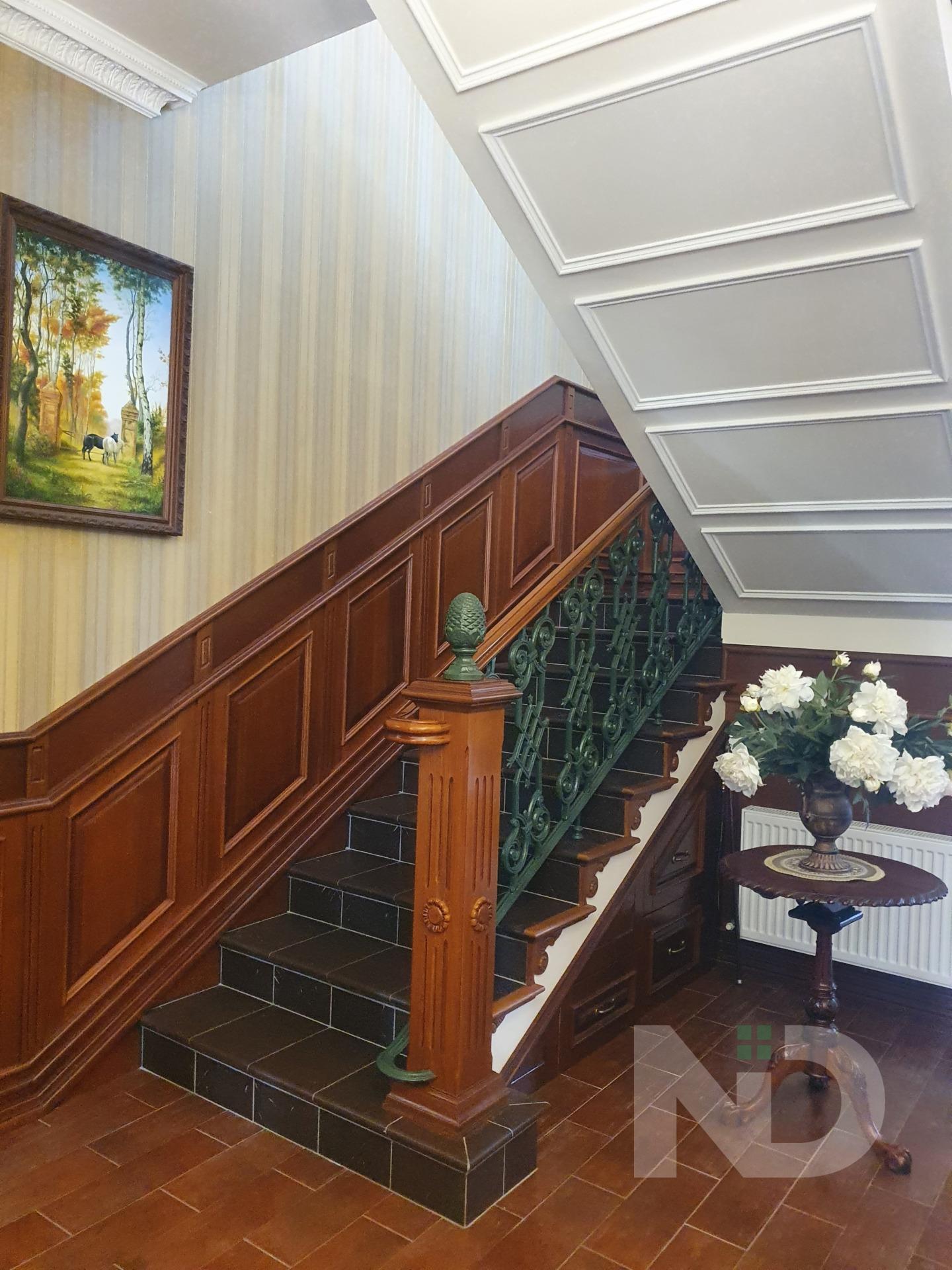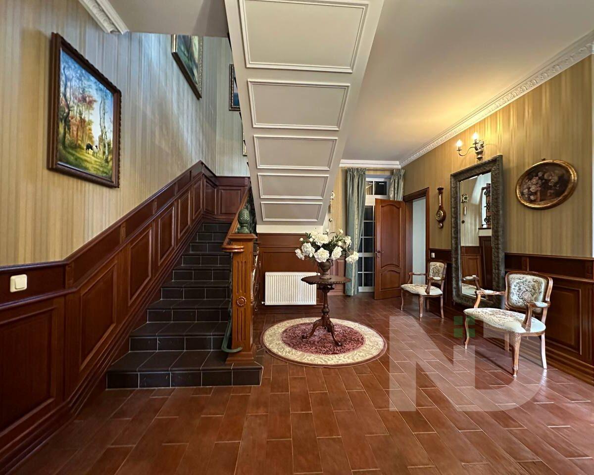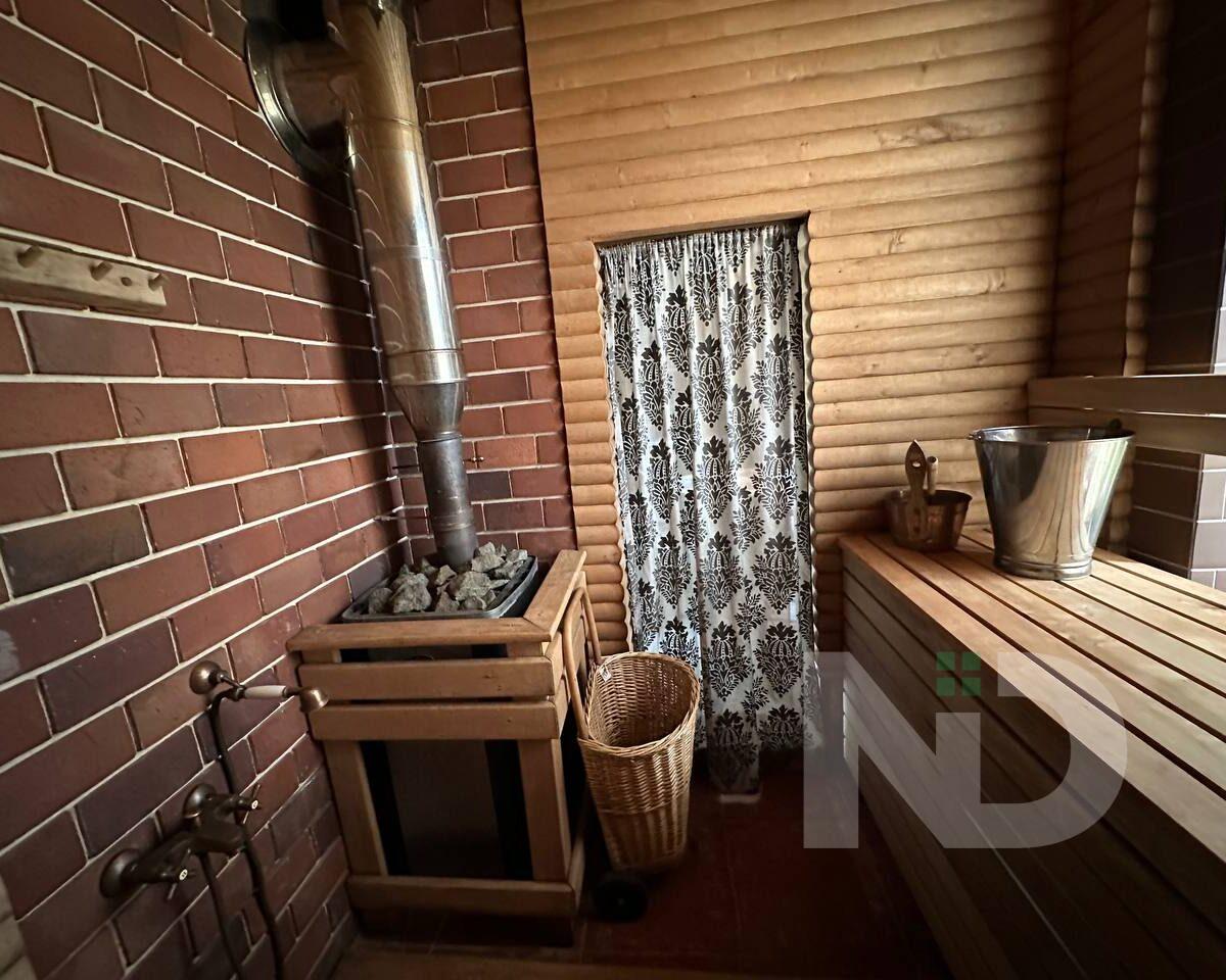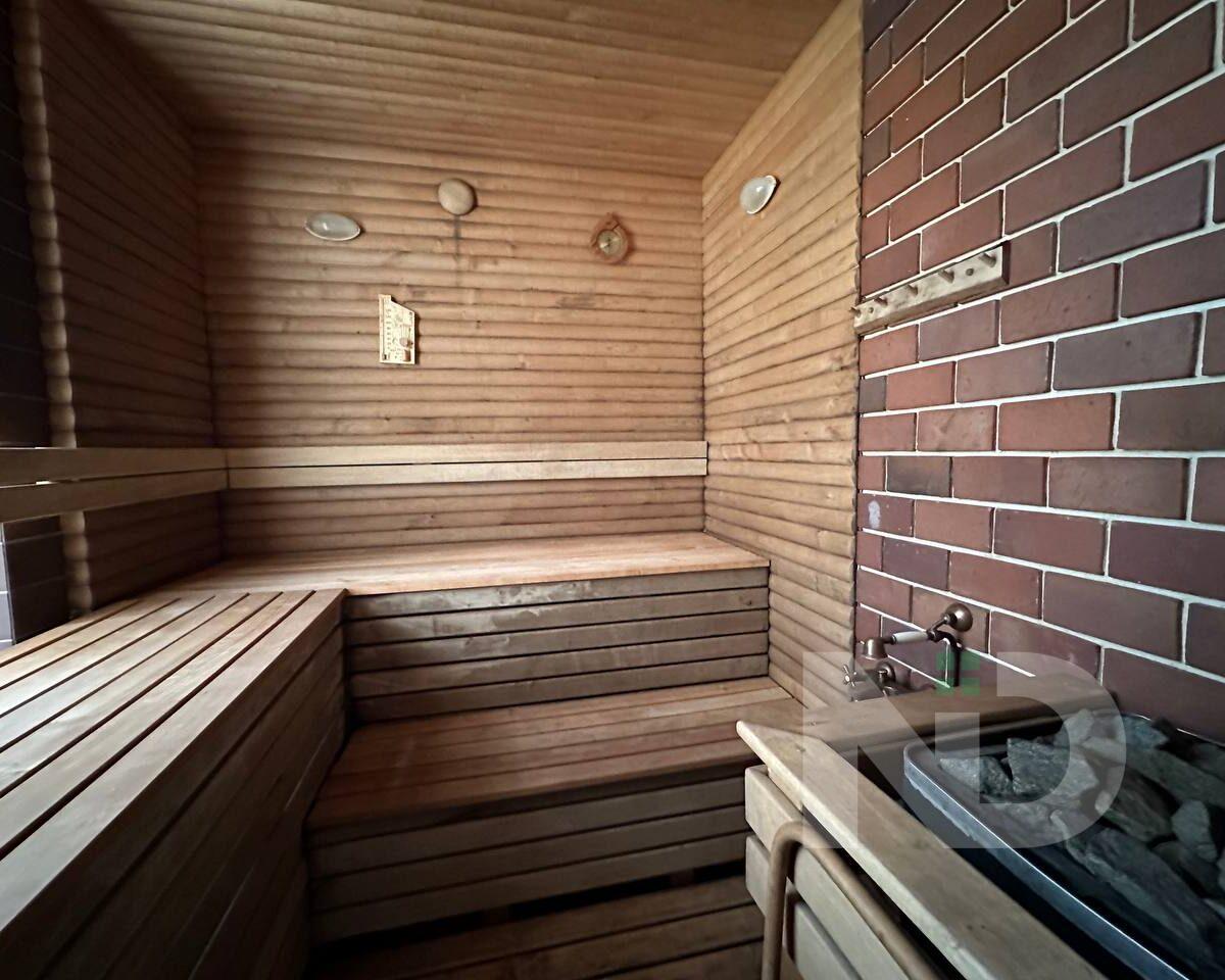 Перший поверх – хол, кухня, їдальня, вбиральня, зал з каміном, 2 санвузли, сауна, вихід на терасу з басейном, кімната відпочинку, пральня, гараж на два автомобілі. Другий поверх 3 спальні  в кожній є свій особистий санвузол і гардеробна, гостьова прохідна кімната.
