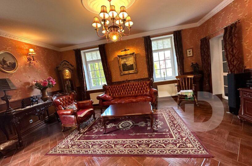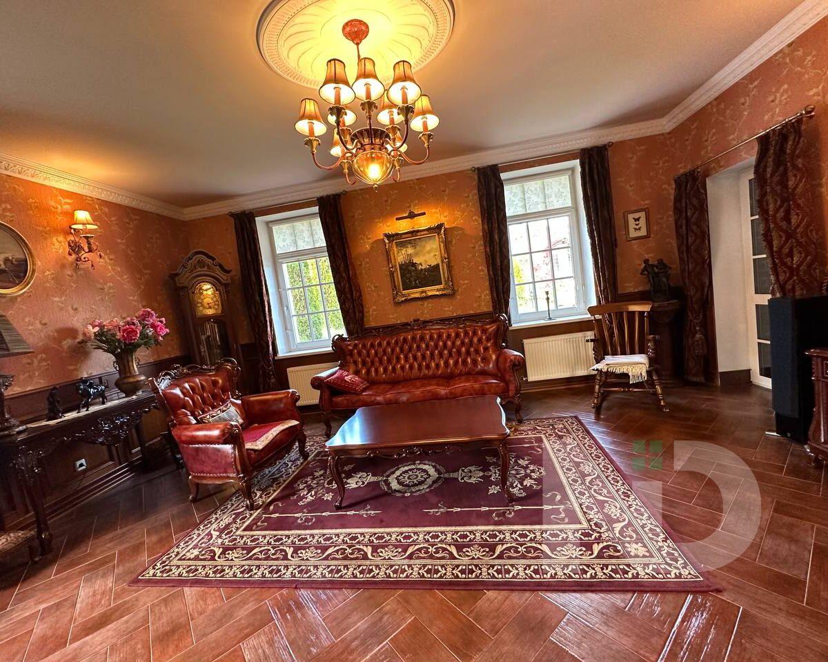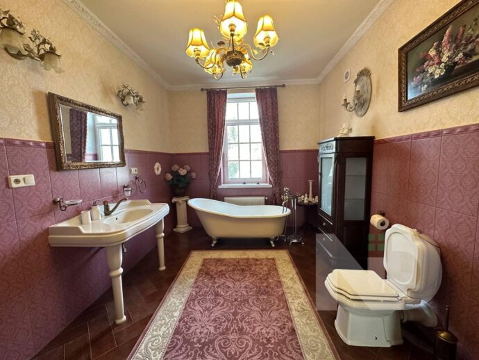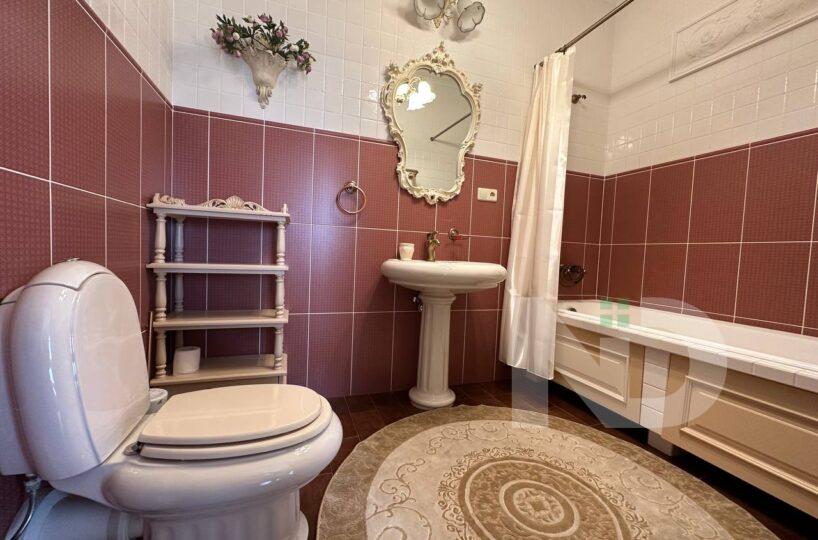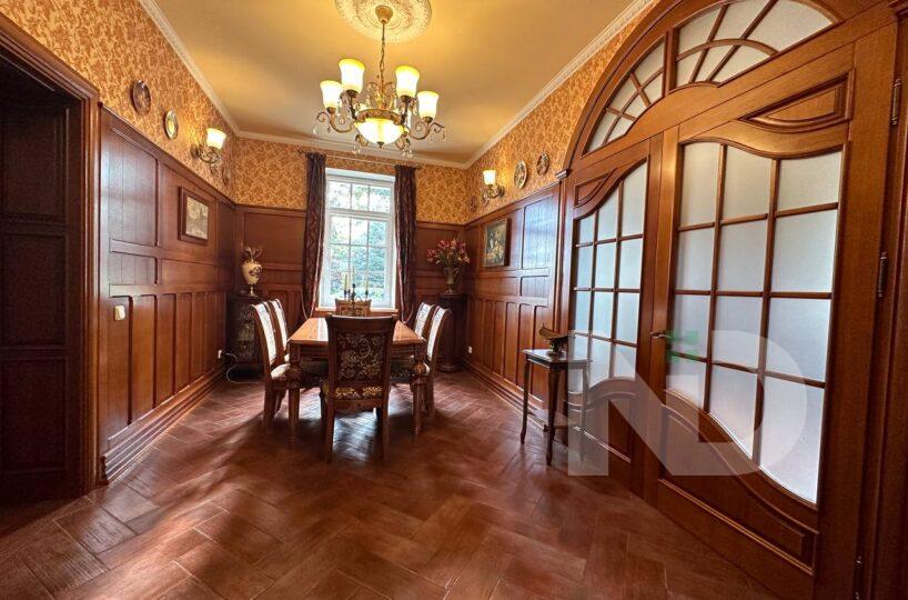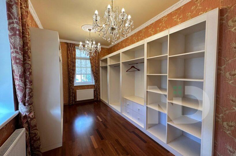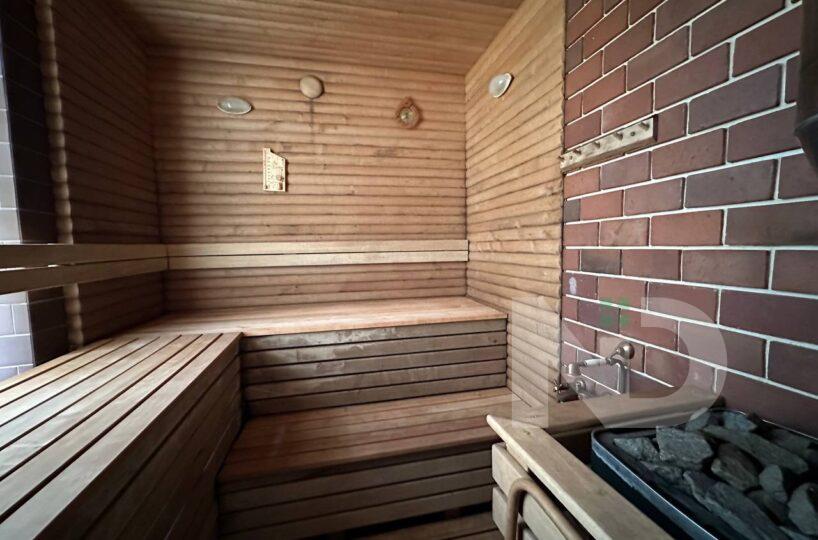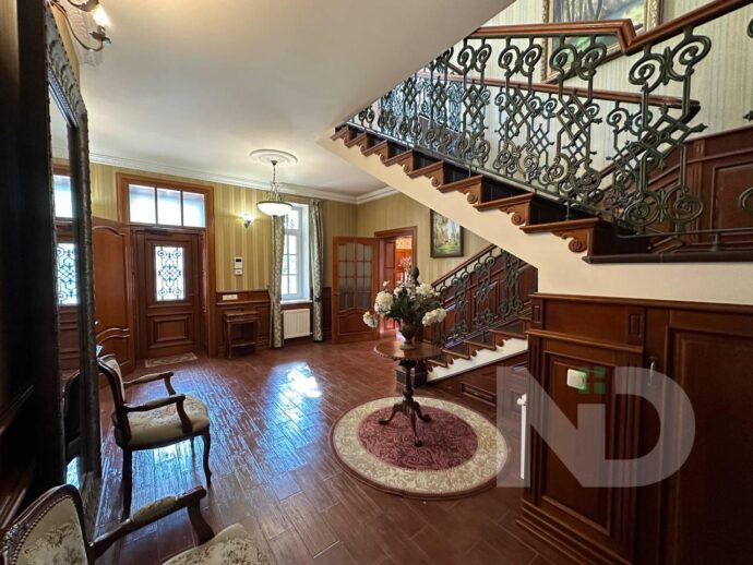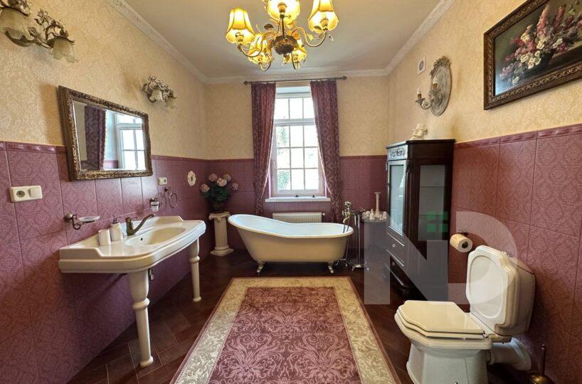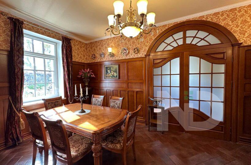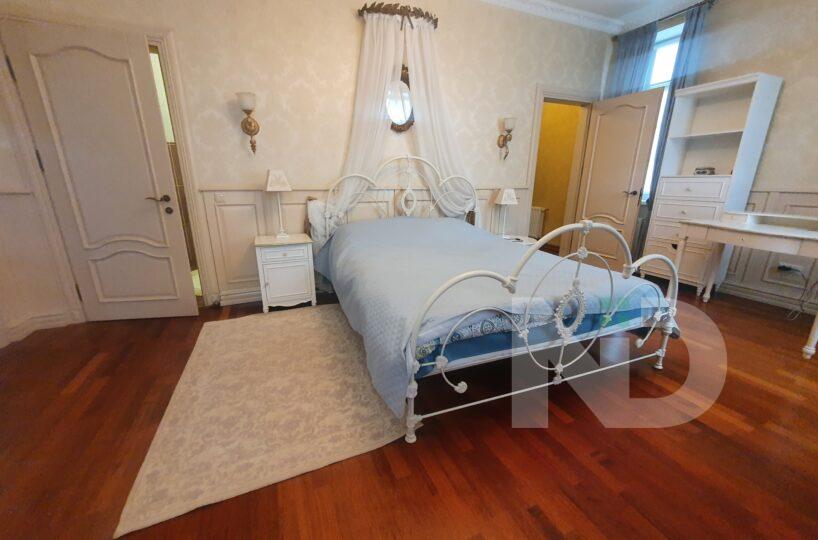 Перший поверх – хол, кухня, їдальня, вбиральня, зал з каміном, 2 санвузли, сауна, вихід на терасу з басейном, кімната відпочинку, пральня, гараж на два автомобілі. Другий поверх 3 спальні  в кожній є свій особистий санвузол і гардеробна, гостьова прохідна кімната.