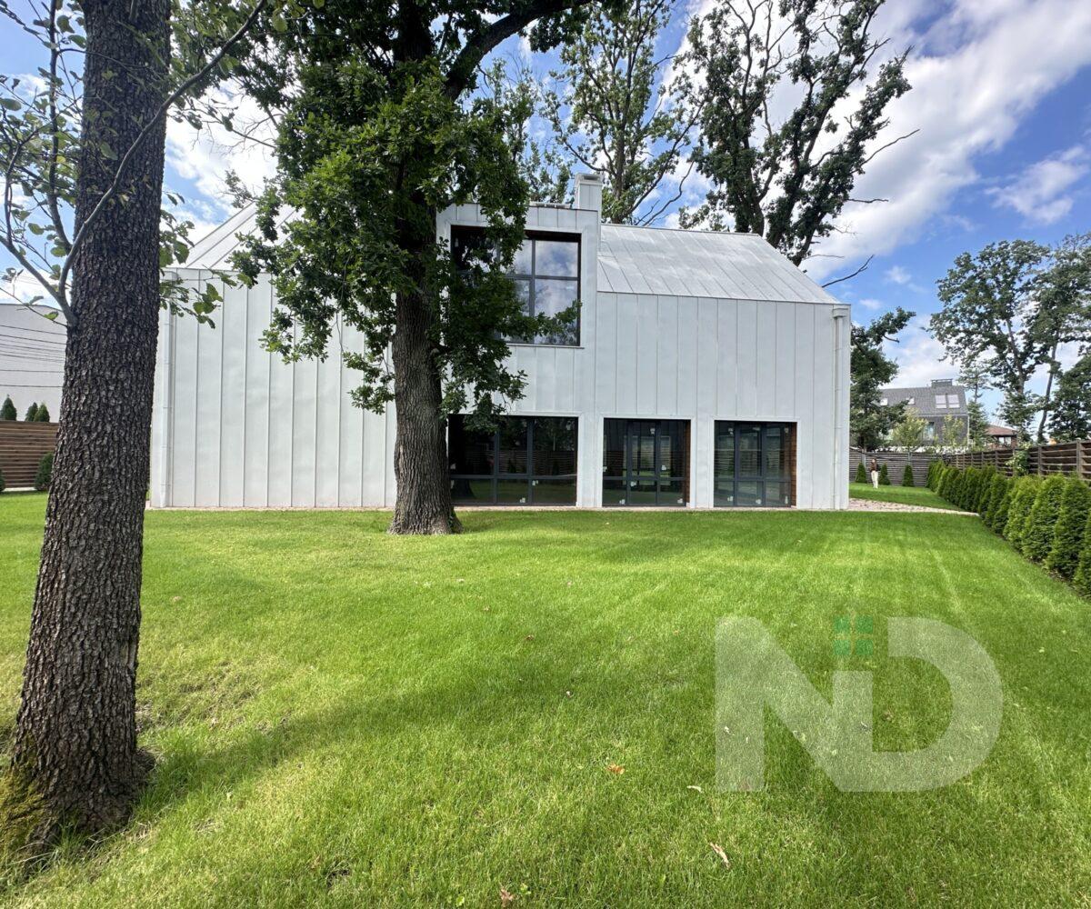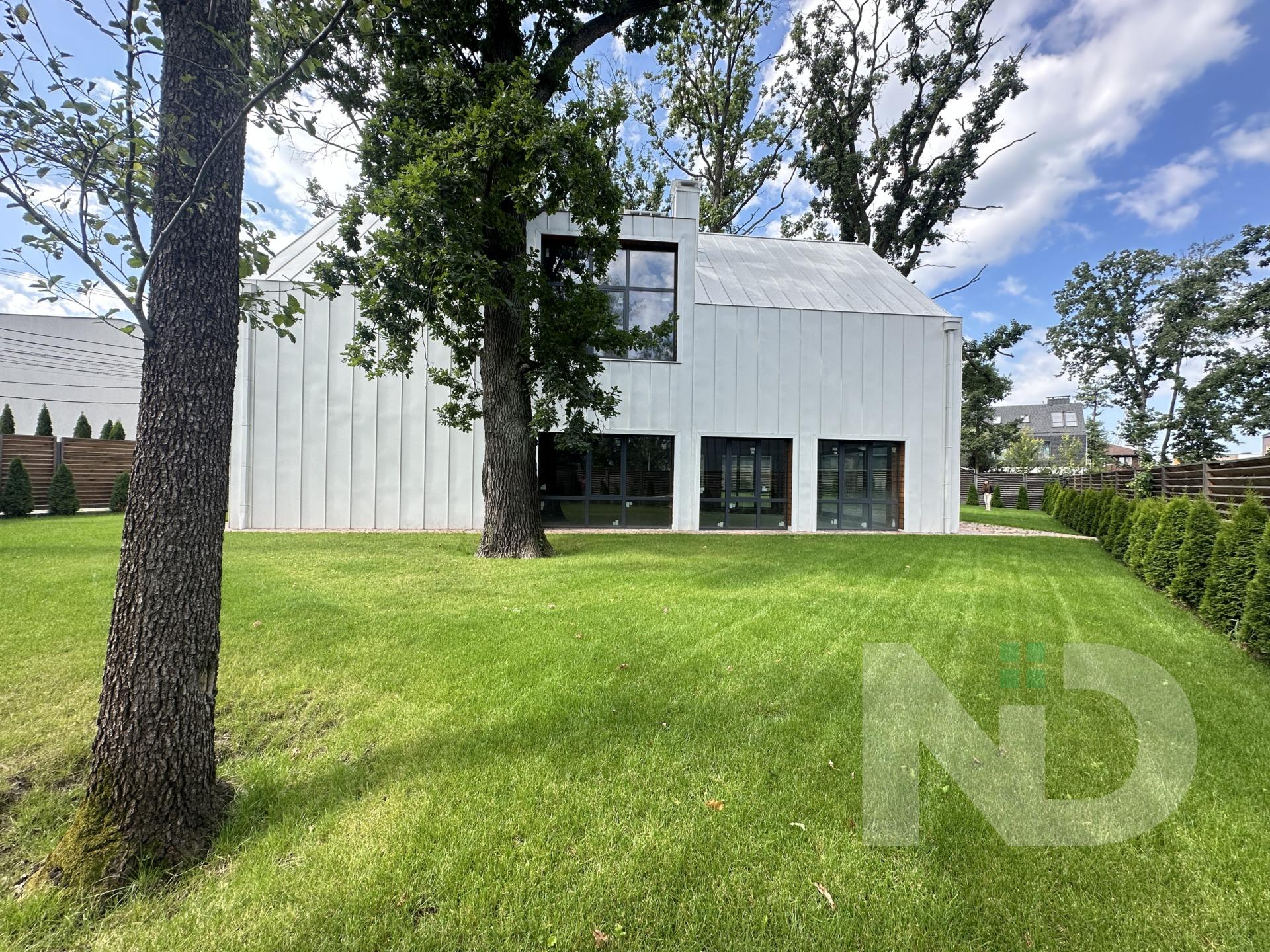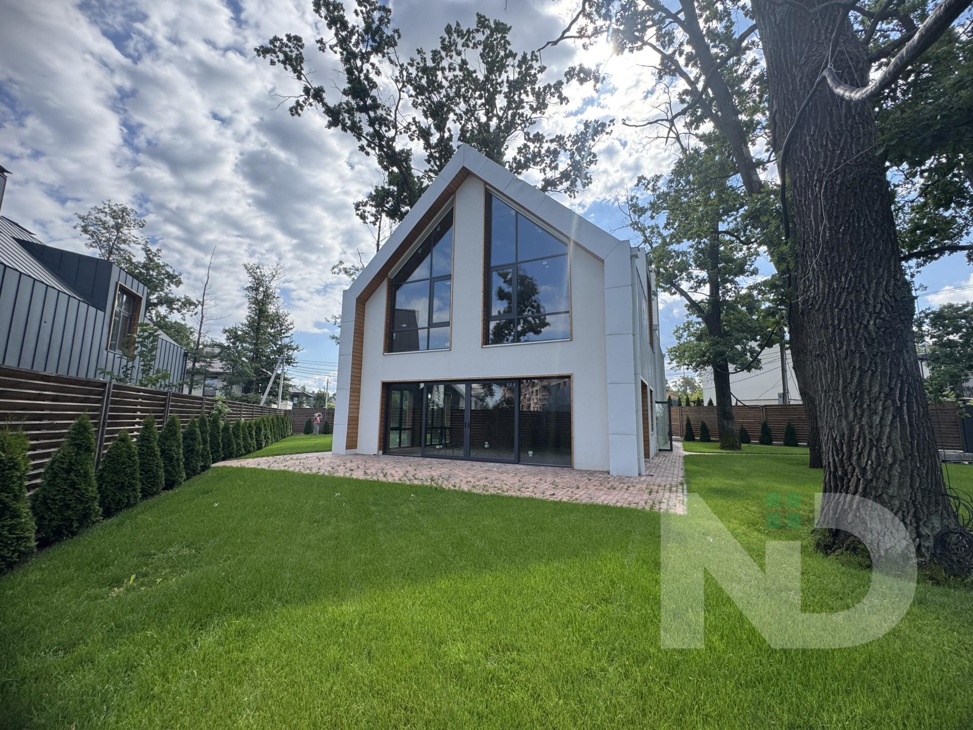Доглянута ділянка з багатьма деревами підкреслює сучасний характер будинку та створює затишну атмосферу.