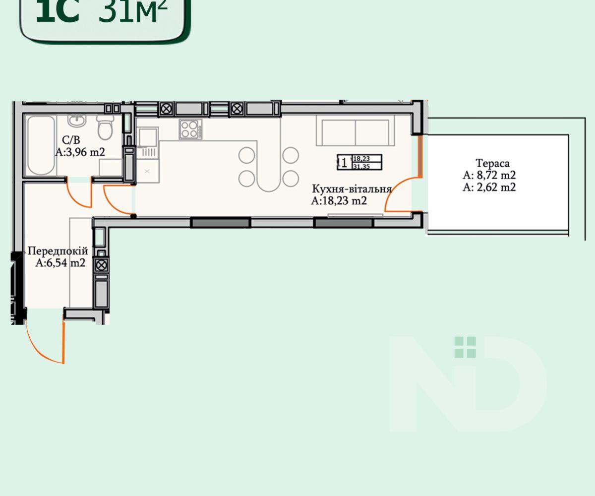 Площа квартири – 31 м2, але її можна вдало зонувати на кухню і зону для відпочинку.