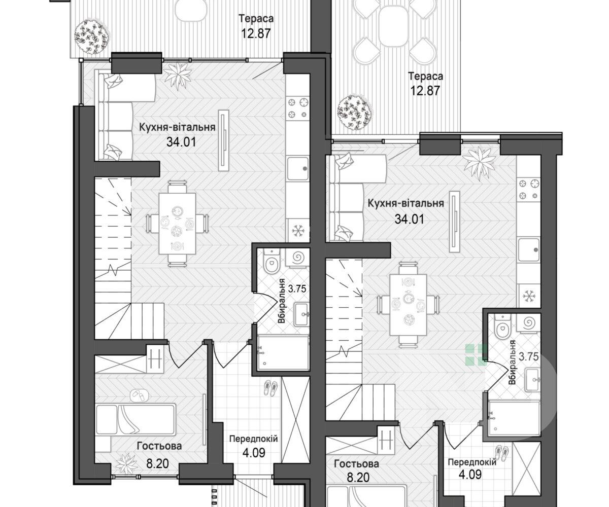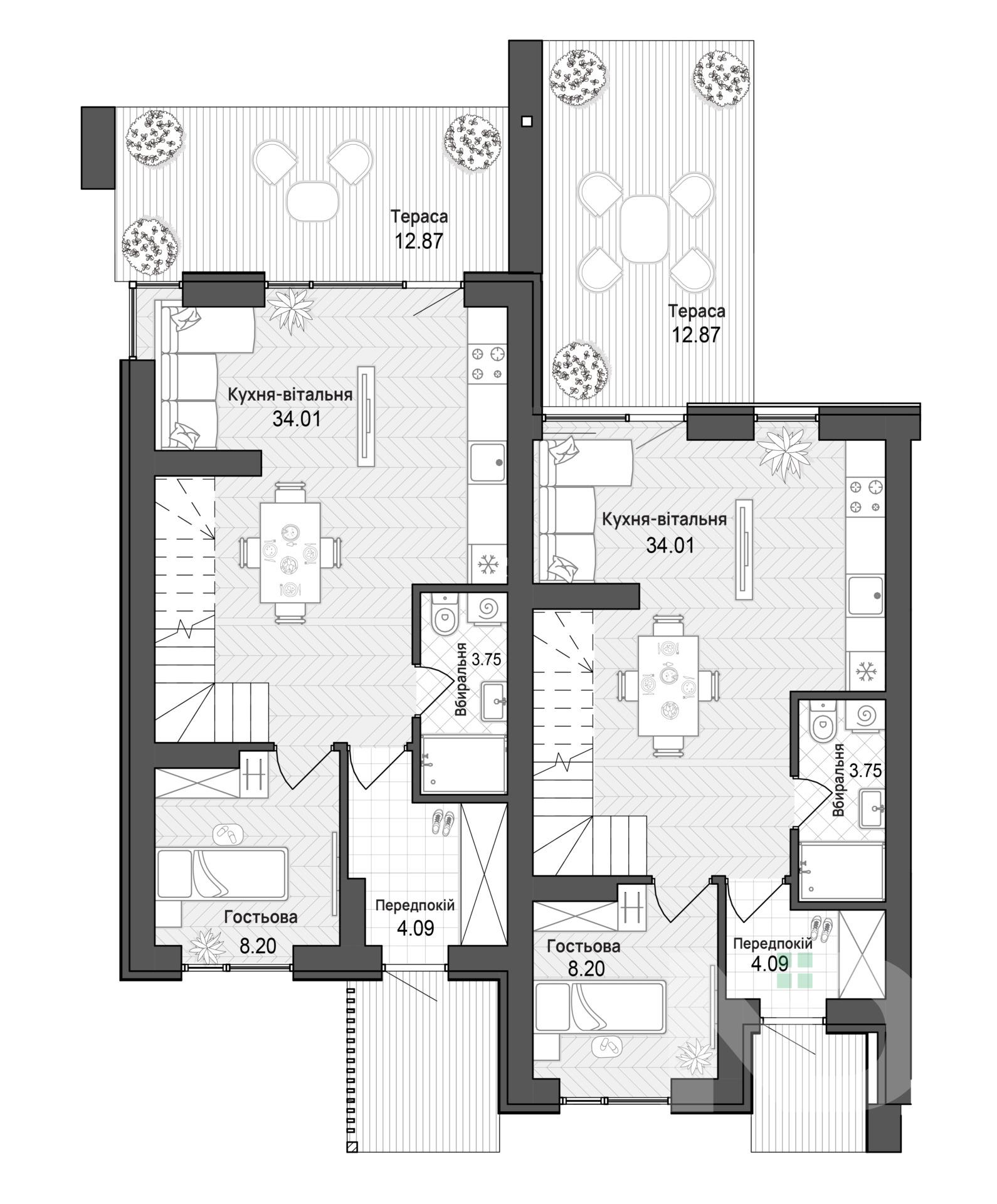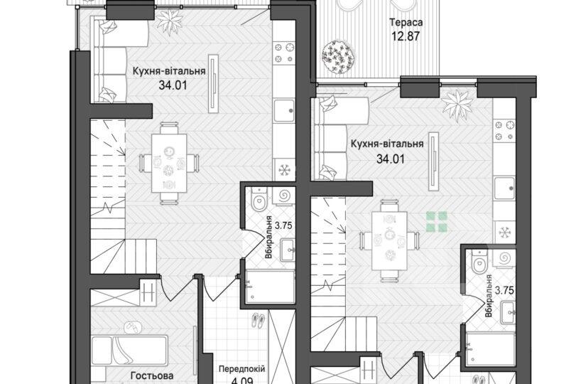 - 1 поверх: простора кухня-вітальня 34 м² із виходом на терасу 13 м², гостьова кімната і санвузол.