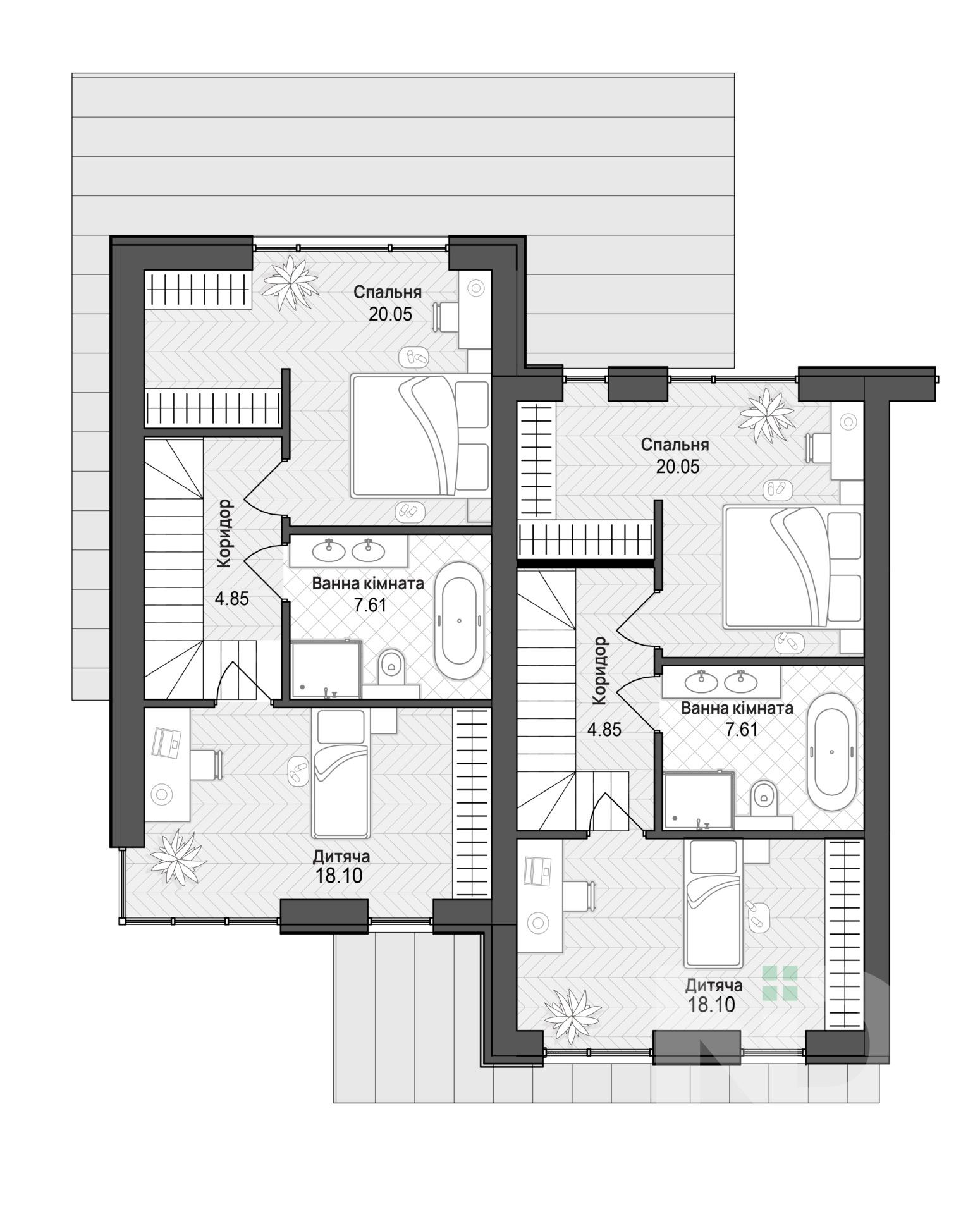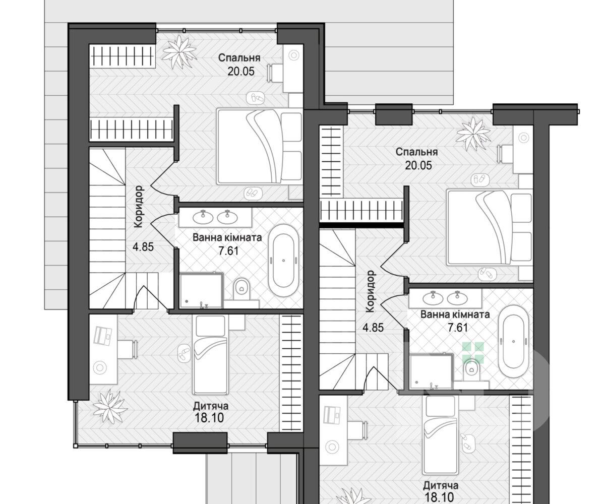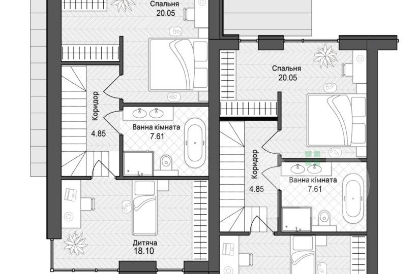 - 2 поверх: головна спальня 20 м², дитяча 18 м², простора ванна кімната, коридор.