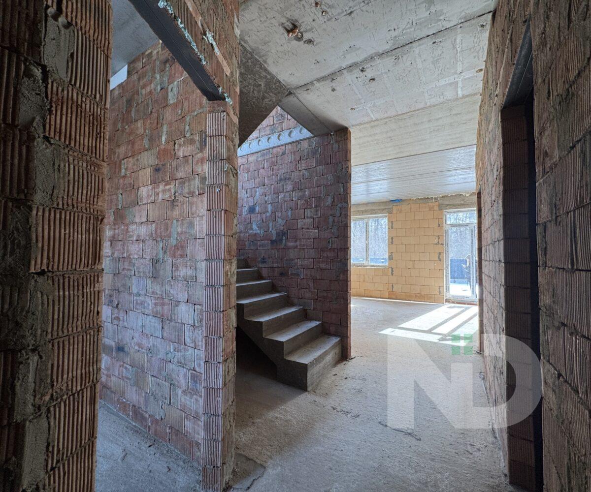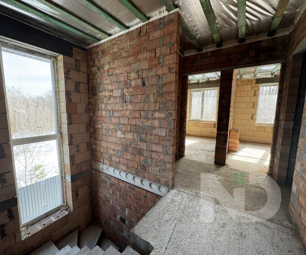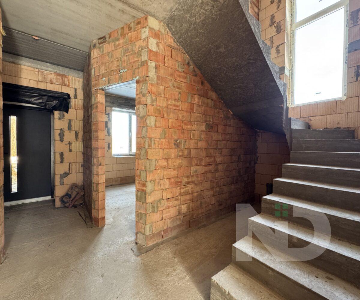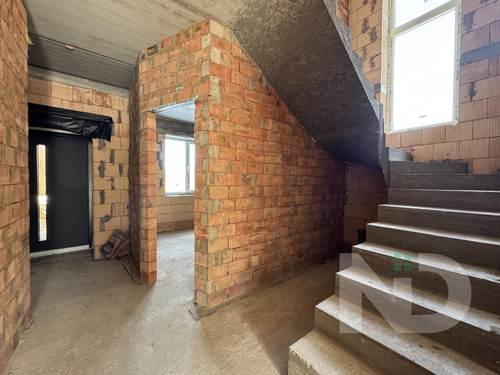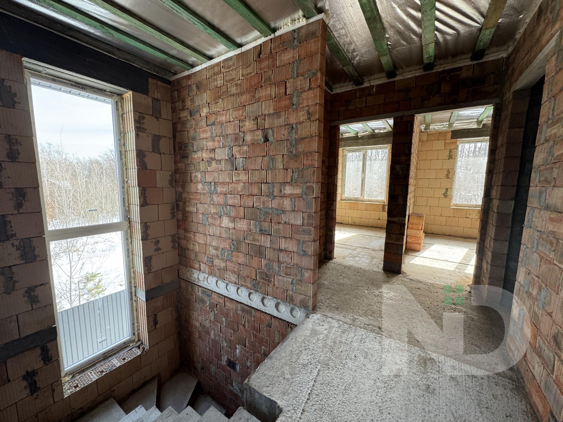 Будинок зведено на монолітному утепленому фундаменті глибиною 1,5 метра з гідроізоляцією. Стіни виконані з керамоблоку 380 мм та утеплені пінопластом 100 мм щільністю 16 кг/м², що гарантує тепло та енергоефективність. Перекриття — бетонні плити, сходи — монолітно-бетонні, а дах накритий металочерепицею. Вікна WDS із двокамерним енергозберігаючим склопакетом на аргоном забезпечують якісну шумо- та теплоізоляцію. Стеля другого поверху додатково утеплена базальтовою ватою 200 мм.