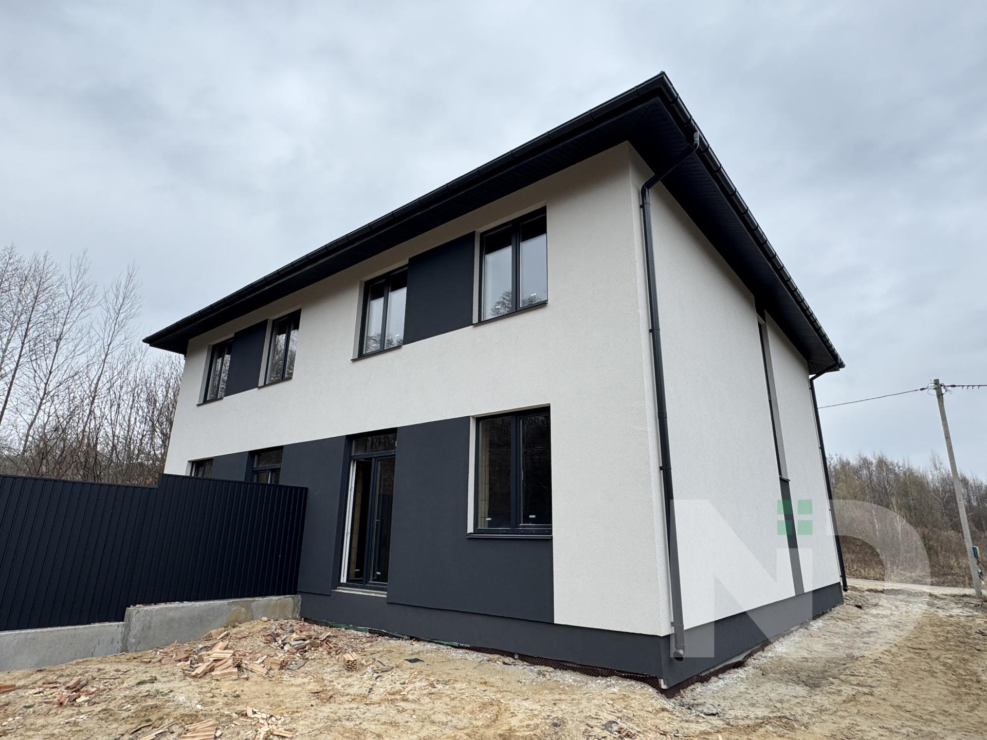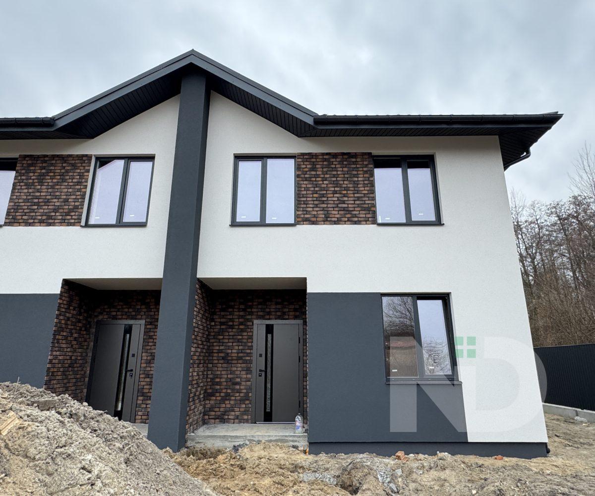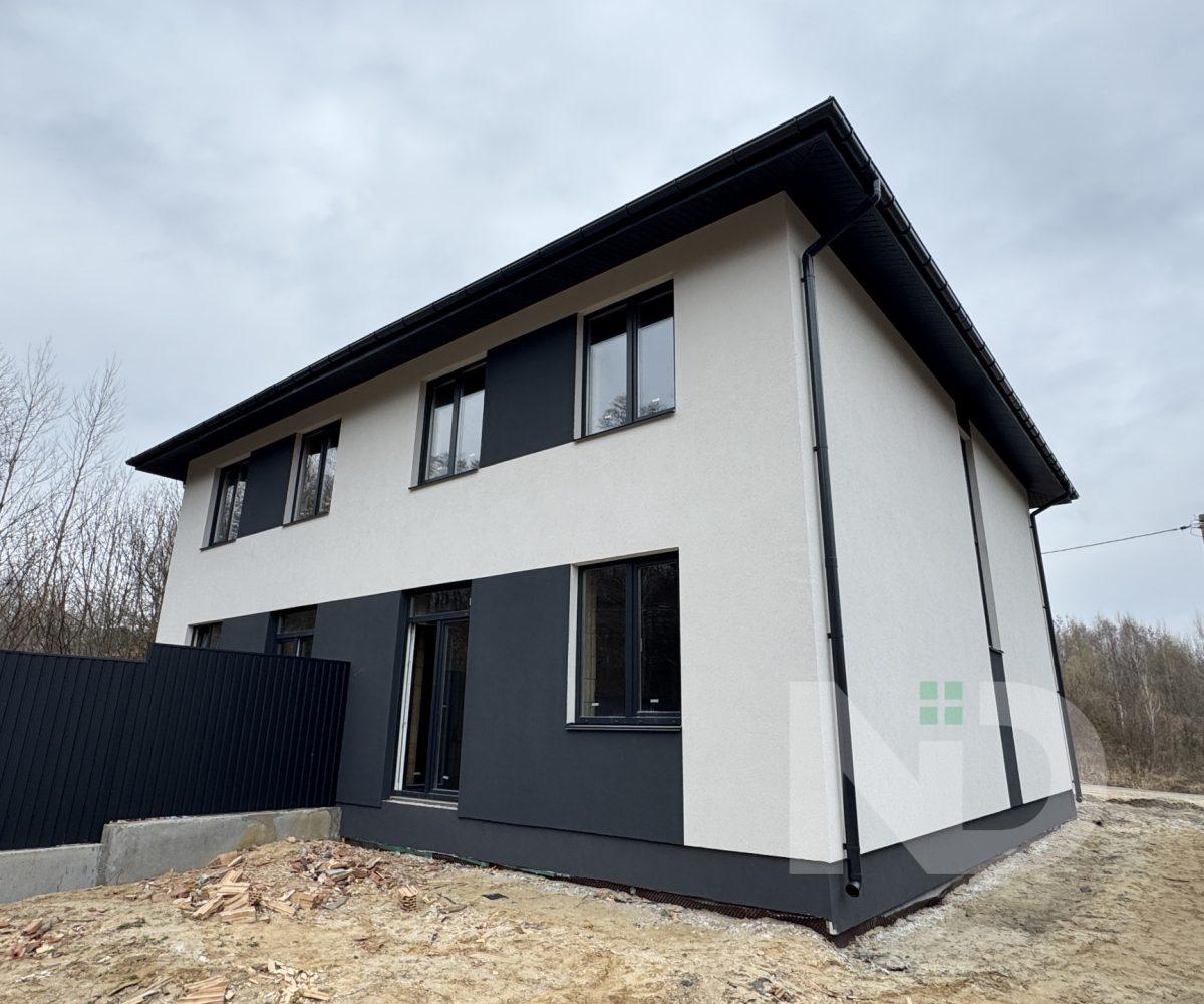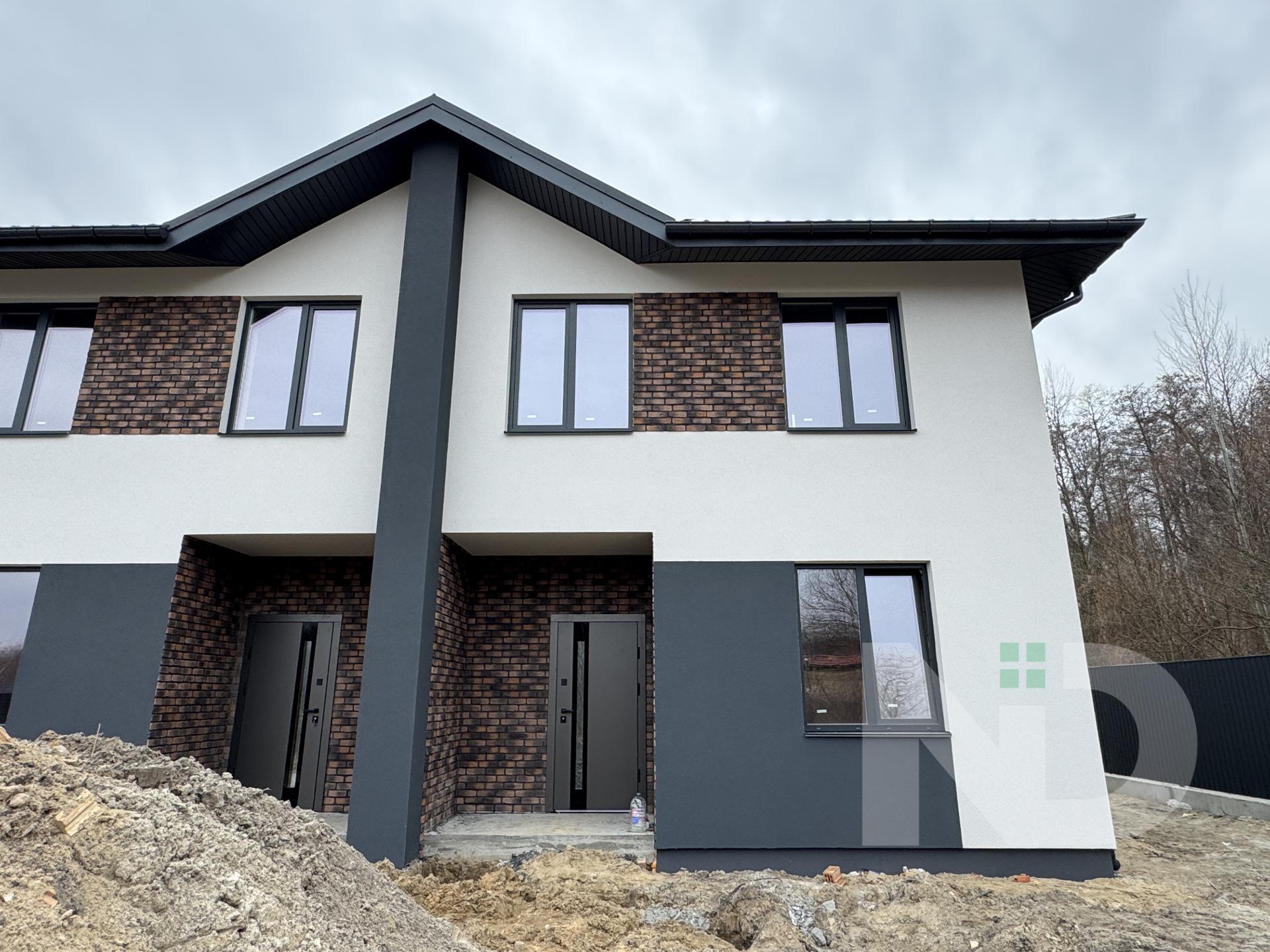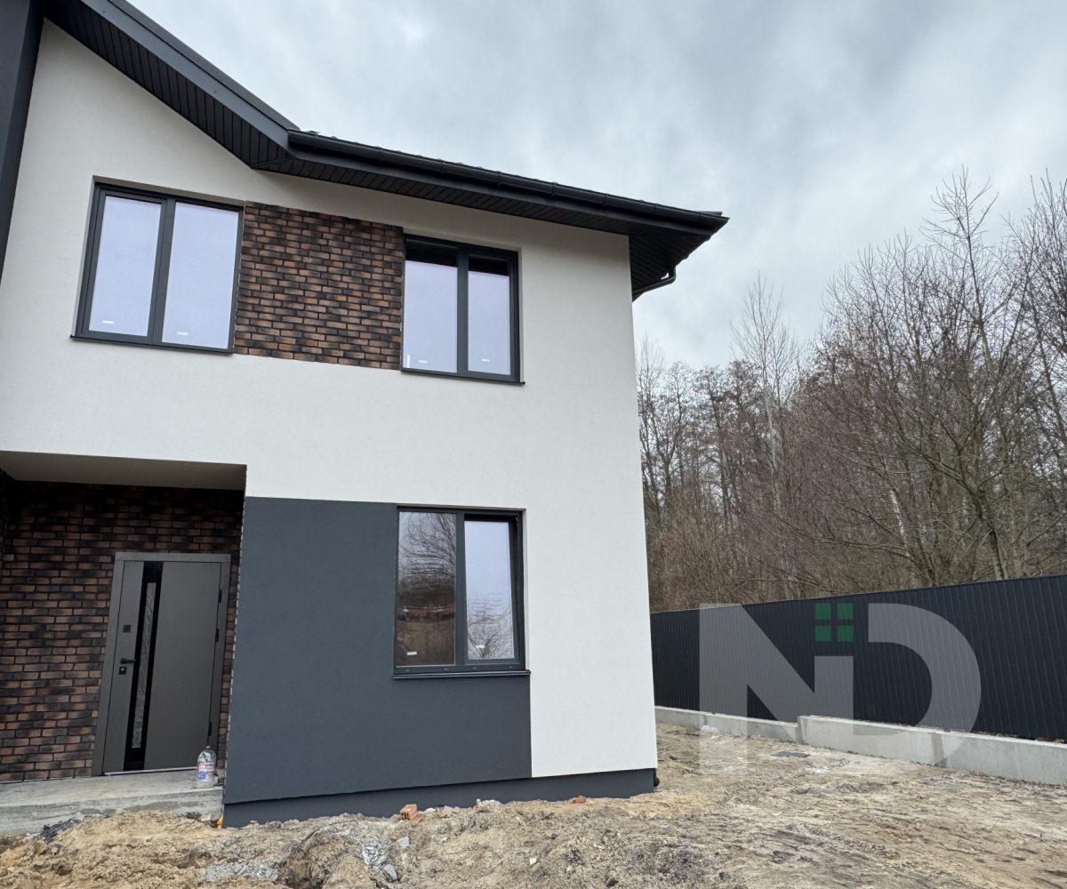 Пропонуємо дуплекс в Ірпені(Стоянка) на затишній вулиці Ранковій — сучасний будинок, зведений із якісних матеріалів і розташований у тихому приватному секторі біля лісу. Фасад виконаний у стриманій сучасній стилістиці: поєднання декоративної фасадної плитки та камінцевої штукатурки створює стильний та солідний вигляд, а великі вікна наповнюють будинок природним світлом.