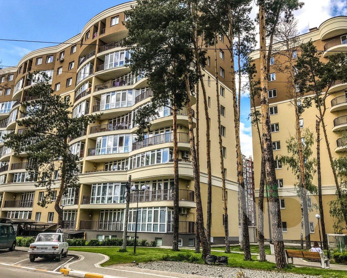 Район заселений, багато магазинів, житлові будинки, поруч будинку є місця під паркування авто.