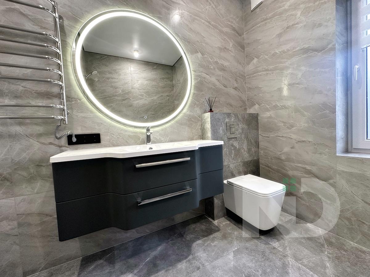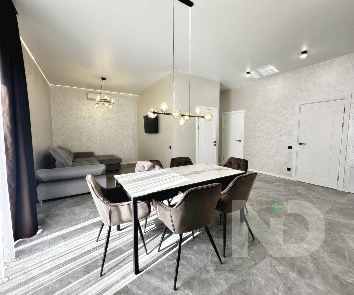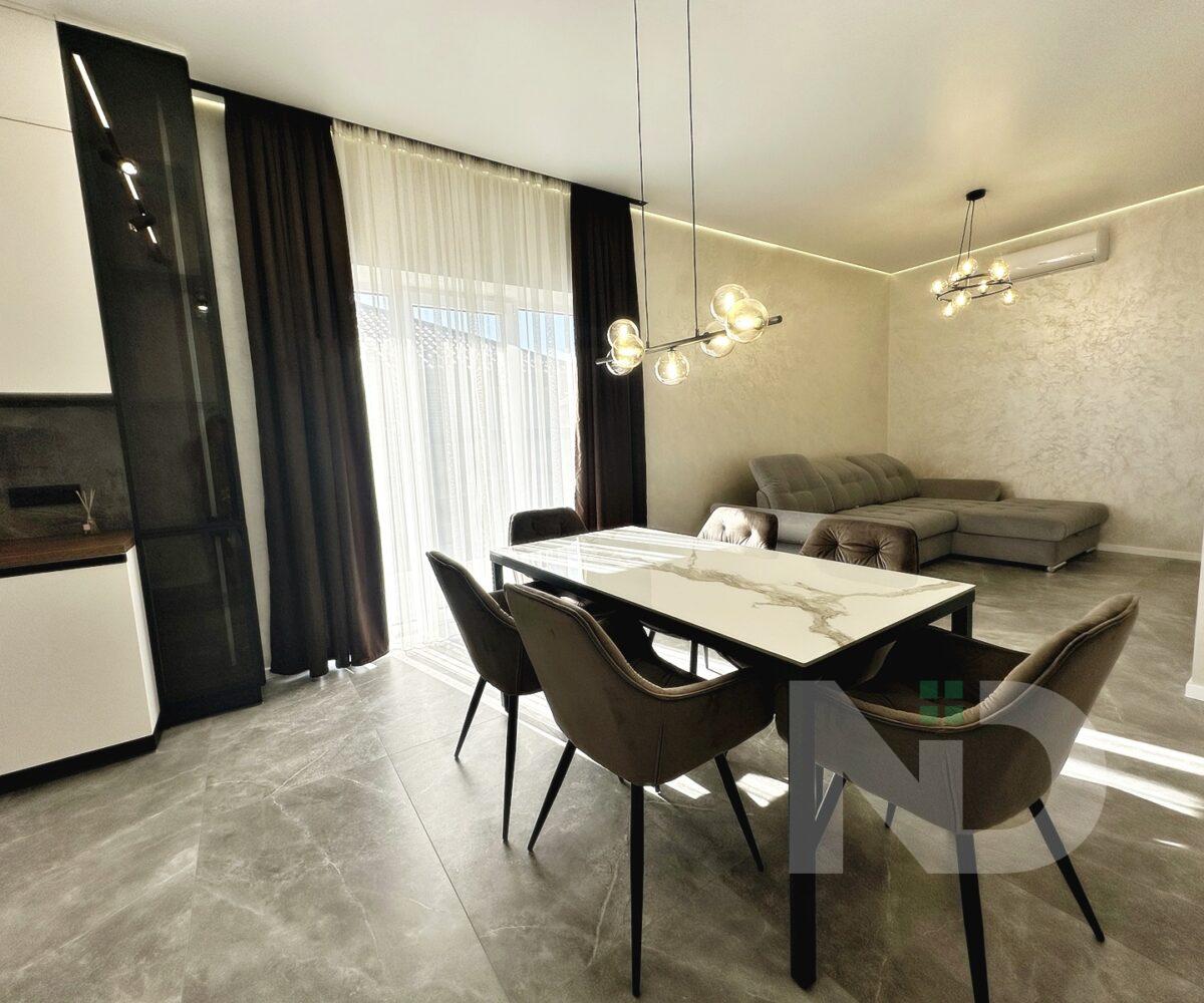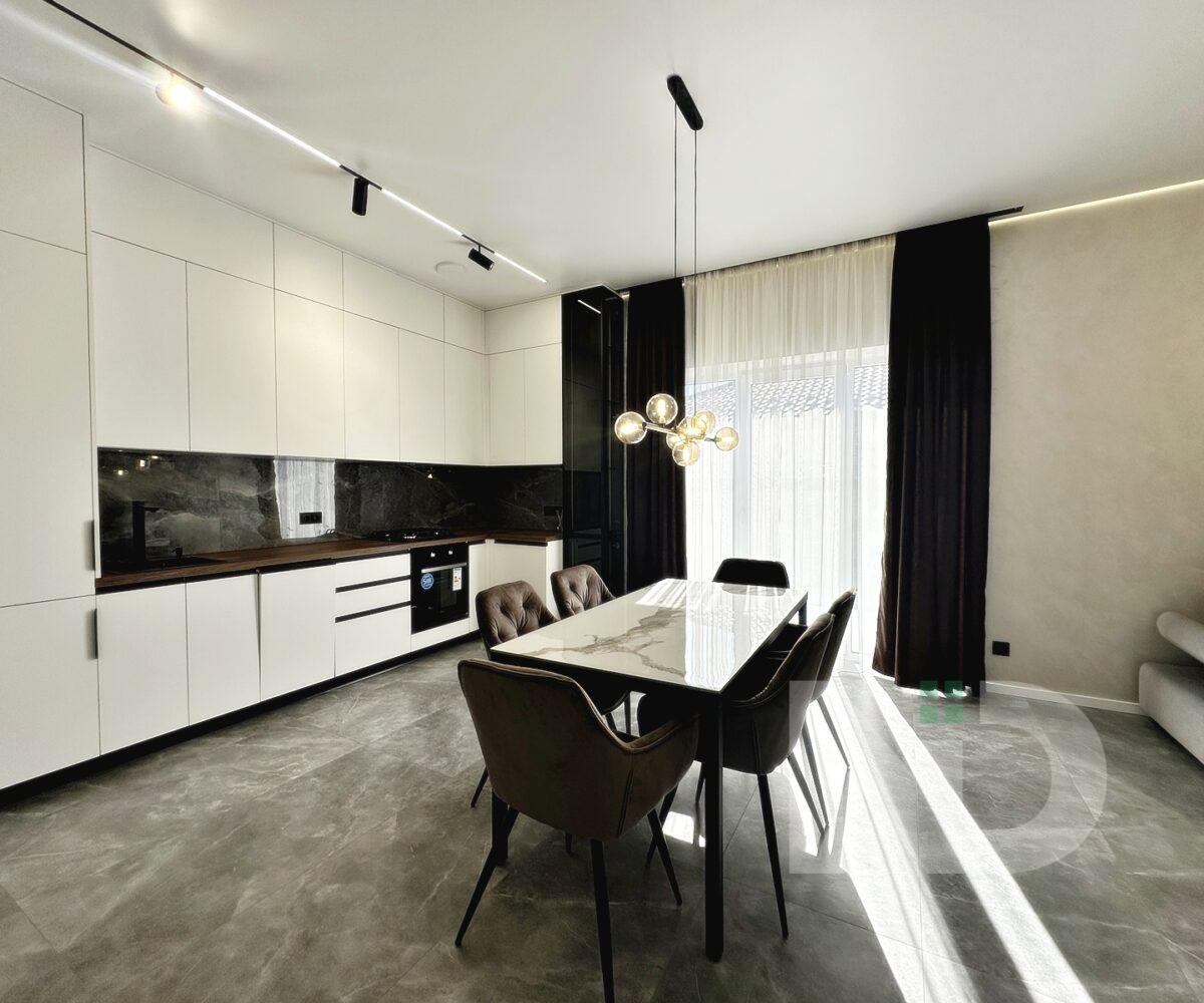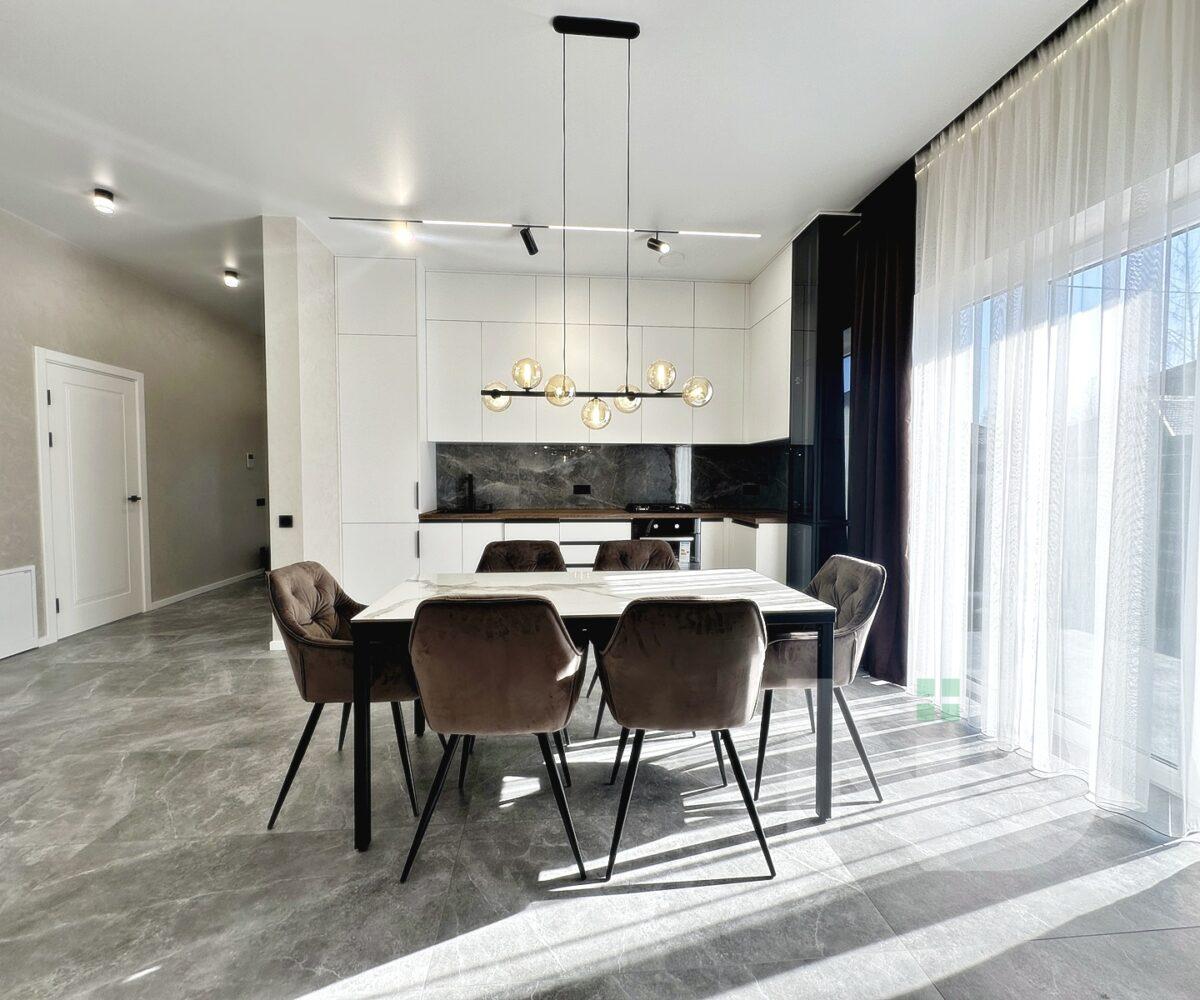 У просторій кухні-вітальні сучасна кухня з вбудованою технікою, затишна зона відпочинку з диваном. Кондиціонери у спальнях та кухні, тепла підлога по всьому будинку.
