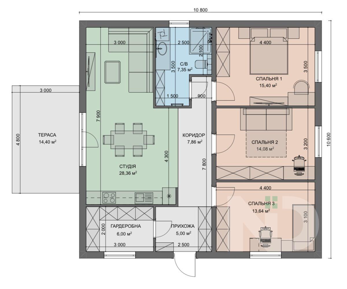 Загальна площа – 98 м², земельна ділянка 4 сотки. Планування: 3 спальні, простора кухня-студія з виходом на терасу, технічна кімната, санвузол, коридор та передпокій.