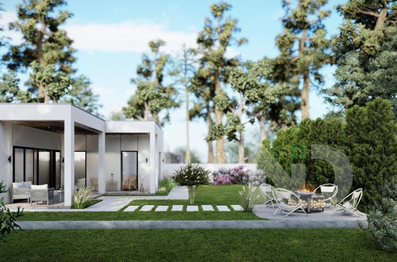 Велика ділянка – 10 соток, тут вже висаджені туї, підключений автополив та посіяний газон.